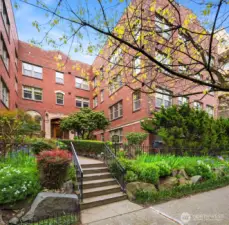 Enjoy a treetop perspective from this top-floor corner unit, elevated above a quiet, tree-lined street and bathed in natural light from abundant windows – 9 to be exact! Historic period details with original oak hardwoods, rich millwork, & coved ceilings. Yet, this home is beautifully updated where it counts with a clean, modern kitchen and stylish bath. SECURE GARAGE PARKING – a rare and valuable find in the neighborhood – completes the package. Queen’s Court is a well-maintained building positioned in the heart of Lower Queen Anne. With a 97 Walk Score, it’s just one block to Climate Pledge Arena and Seattle Center, not to mention countless amenities. Pet-friendly HOA with community garden, library, laundry room, & assigned storage space.