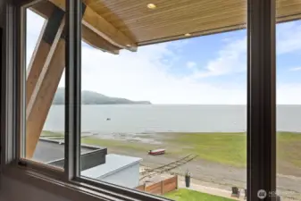 Extraordinary custom luxury estate on rare no-bank waterfront at the quick-access, most desirable, North tip of Camano Island’s Gold Coast. Just minutes to I-5 and an easy drive to the Eastside — no ferry required — this is walk-out beachfront living at its finest. Step from your Great Room directly onto the sand, launch a paddleboard, watch whales in the distance, or boat-up and tie-off in front of your home. Architecturally designed with no expense spared, the residence showcases 12’ ceilings and a stunning 28’ wide disappearing Fleetwood glass wall that fully opens the living space to the waterfront deck. Chef’s kitchen with Wolf and Sub-Zero appliances, honed marble countertops, full marble backsplash, hammered nickel sink & custom mahogany cabinetry. Main-level primary suite with 14’ ceilings, spa bath, limestone slipper tub & deck access with panoramic bay views. Upper-level features loft plus two oversized bedrooms with walk-in closets and water views from both bedrooms. Main level also offers an executive office with view and a bonus/exercise room--both which are flexible living spaces. Fifteen-foot ceiling garage accommodates indoor boat/RV parking. Metal roof, marine-grade finishes, Brazilian Walnut (Ipe) decking and fence, private shoreline with bulkhead tie-offs. No HOA. Allowable STR. Estimated $6M+ to reproduce at today’s costs, making this an exceptional value. A rare opportunity to own an irreplaceable, custom, walk-out waterfront estate. View the video!