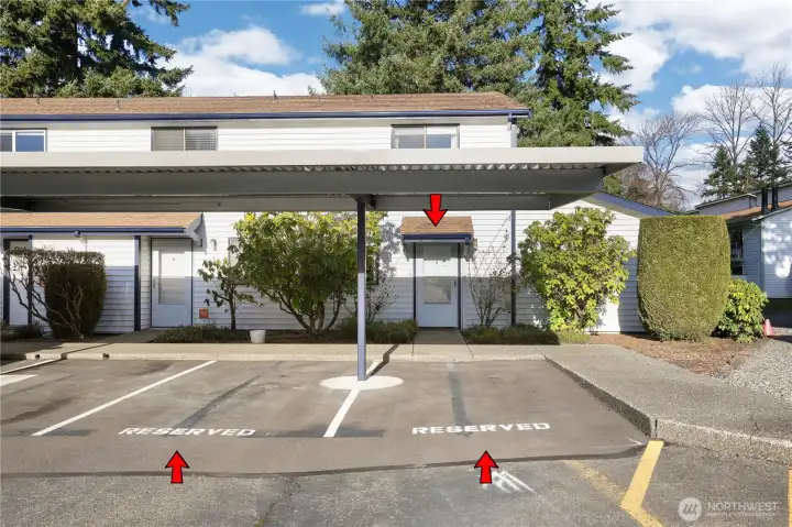 Welcome to the Tall Firs community in Federal Way! This 3 bedroom, 2 full bath, two-story condo offers a functional layout with inviting outdoor spaces. Enjoy ground-level entry into a spacious living room featuring a cozy wood-burning fireplace and sliding door to a covered patio with extra storage—perfect for year-round enjoyment. The kitchen is equipped with stainless steel appliances and ample cabinetry. The main level includes a full bathroom and a bedroom with access to a second patio and yard area, ideal for guests, a home office, or flex space. Upstairs you’ll find two additional bedrooms, including the primary suite with its own balcony retreat. A washer and dryer are conveniently located in the unit. Two reserved carport parking spaces are directly in front of the home. Community amenities include an outdoor pool, clubhouse, and sports courts. Conveniently located just minutes from shopping, dining, parks, and commuter routes, this home combines comfort and convenience in a desirable setting. Mortgage savings may be available for buyers of this listing.