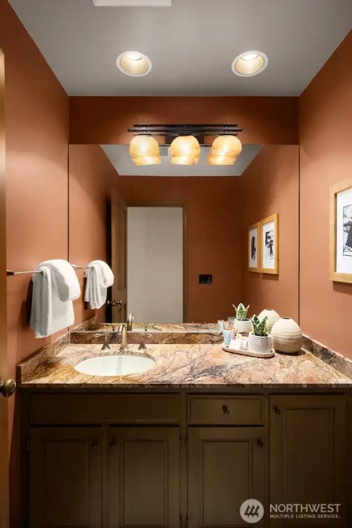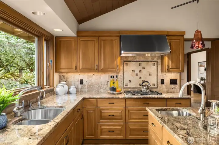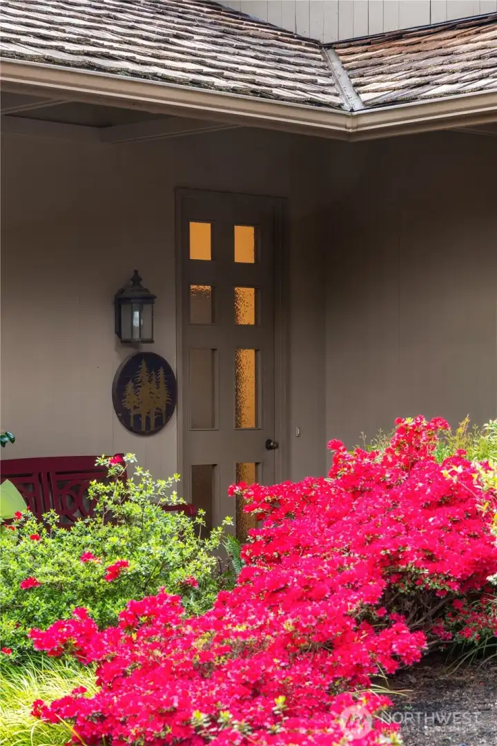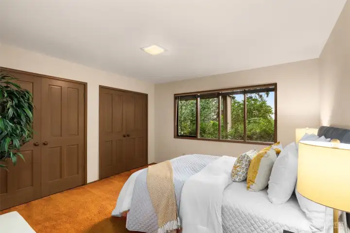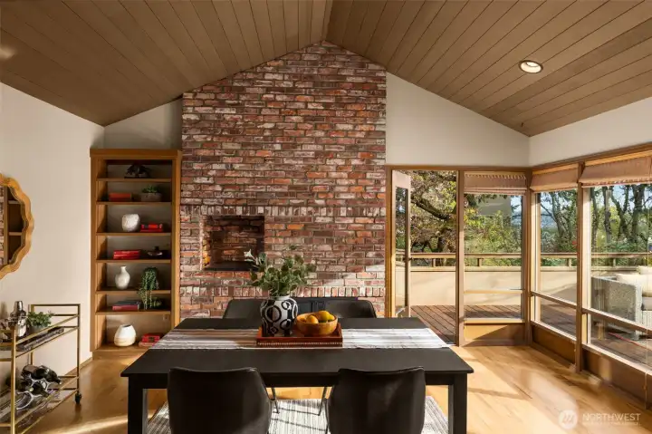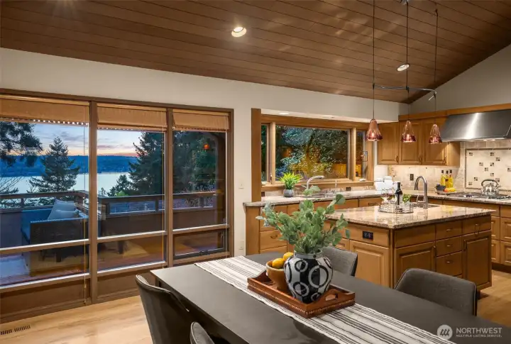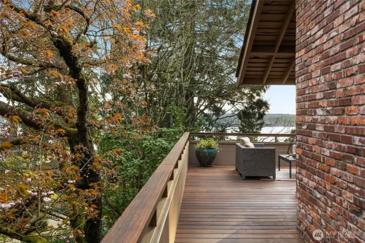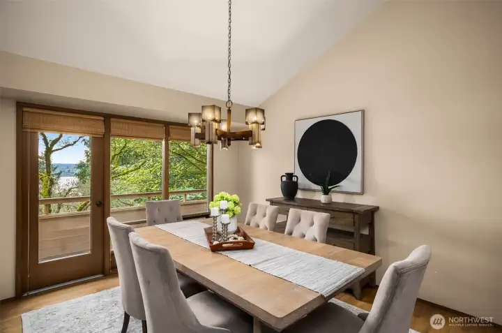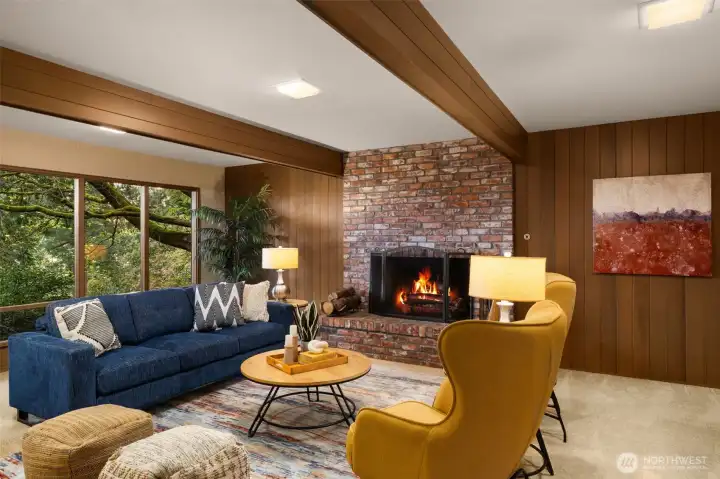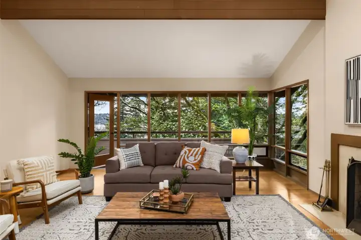 Classic NW Contemporary by Black & Caldwell, rich with authentic mid-century character and quality. Warm wood, tongue-and-groove cedar ceilings, vaulted volume, and expansive window walls create a bright, timeless backdrop. Cherished by the original owners and beautifully preserved for the next great steward. Western exposure captures Lake Washington and sunset views. Inviting gathering areas include a spacious living room with vaulted ceilings and a cozy fireplace, plus a well-designed kitchen and adjacent family room that open to a west-facing view deck. The primary suite enjoys its own deck and separation from additional bedrooms for added privacy. A dedicated office with exterior entrance offers flexibility for work-from-home, or client meetings. The lower level includes three bedrooms, a full bath, and a generous recreation room. Exceptional future upside with approx. 600 sq ft unfinished space featuring high ceilings, plumbing, windows, and an exterior door—ideal for a guest suite, bonus room, workshop or gym. Surrounded by lush gardens and privacy, this special home offers a true sense of retreat on a peaceful cul-de-sac with neighbors who look out for one another.