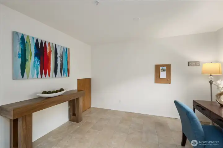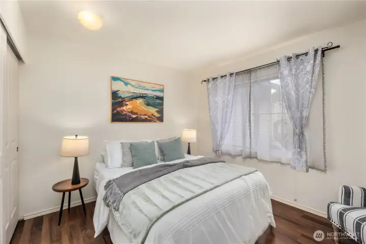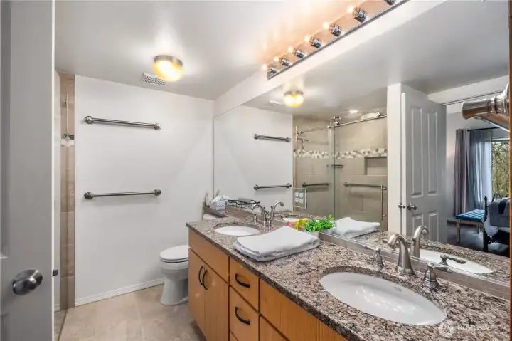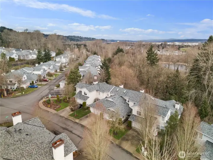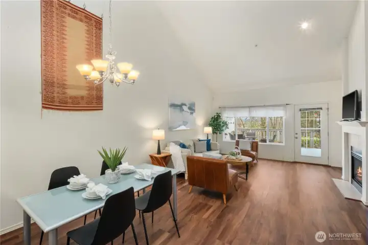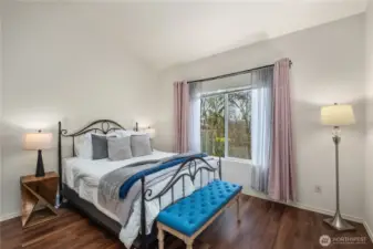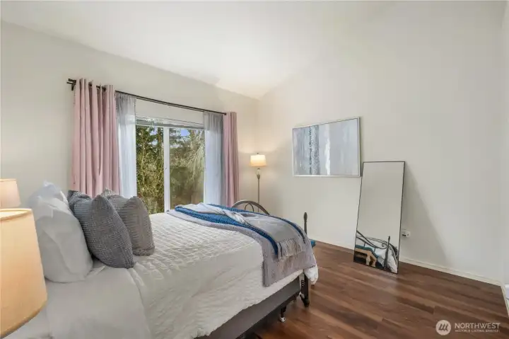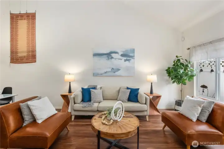 Light-filled and spacious two-story townhome in the gated Meadows at Riverview community. Soaring vaulted ceilings and large windows fill the home with natural light while showcasing peaceful greenbelt views. The open living and dining areas feature beautiful luxury vinyl plank flooring and a cozy gas fireplace, creating the perfect space for everyday living or entertaining. The updated kitchen offers granite countertops, stainless steel appliances, gas range with double oven, custom pantry with abundant storage, and a high bar ideal for entertaining. Rare main-level primary suite includes dual vanities with granite counters, updated cabinetry, walk-in tiled shower and walk-in closet. A bonus room with built in cabinet and convenient half bath complete the main level. Up the newly carpeted stairs you’ll find an additional bedroom, full bath, and loft space ideal for a home office, media room, or guest area. Enjoy your newly refurbished private deck overlooking lush greenery and views of the Cascades. Attached 2-car garage plus driveway parking. Convenient access to I-5, Hwy 167, shopping, parks, trails, and SeaTac Airport.