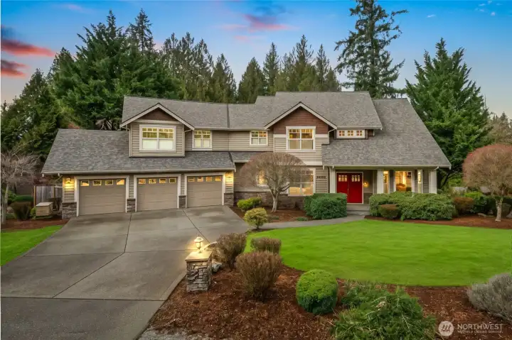 Unmatched quality, craftsmanship & privacy define this custom residence on an expansive shy ½ acre homesite. Set on an intimate 12-home cul-de-sac, it offers a rare blend of seclusion, luxury & convenience—without the Sammamish Plateau commute. Step inside to soaring ceilings, abundant natural light & premium finishes throughout. Main floor features an open layout w/extensive Brazilian cherry hardwoods, inlaid entry, custom-stained Douglas Fir millwork & box-beam detailing. Slab-granite chef’s kitchen includes stainless steel appliances, tile backsplash, generous island, abundant cabinetry & pantry w/pull-outs. A dedicated office w/French doors, elegant living spaces & seamless indoor-outdoor flow complete the main level. Upstairs, the Primary Suite is a true retreat, offering a fireplace, spa-inspired 5-piece bath w/jetted soaking tub, dual vanity & spacious walk-in closet. Large secondary bedrooms & a bonus room provide comfort & flexibility. Lower level is ideal for guests or multi-generational living, featuring flex room, huge rec room, multiple storage closets, generous bedroom & full bath w/direct outdoor access. Additional highlights include covered porch, low-maintenance composite deck, patio, 800 SF 3-car garage w/abundant overhead storage & whole-house generator. The grounds are exceptional—custom landscaped front & back, fully fenced w/sprinkler system, mature plantings & 7 espalier fruit trees offering a rare combination of space, serenity & enduring privacy.
