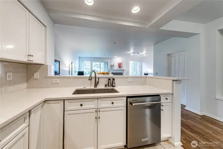 Luxury living & convenience abound at Bellevue's Le Chateau! Like living in a 5-star hotel, this spacious 1,212 square foot ground floor unit has everything you'll need. Lives even bigger than the generous footage with an open floor plan, tall ceilings, and ample natural light. Flexibility for all your needs with den with palatial pillars & walk-in closet. Over $150k in upgrades over last several years. Spotless kitchen with quartz counters, full backsplash, high-end appliances & elongated dining bar. Stylish LVP flooring! Primary suite with epic, remodeled 5-piece bath (dual showers including a walk in!) complete with custom tile. Generous covered patio opens to ornate gardens. Secure garage with elevator & storage unit. Ample guest parking & exquisite amenities - lobby, parlor, gym, pool, & more. Minutes to I-90, I-405 & downtown! Rental cap is met. Strong HOA with no assessments. Incredible Bellevue schools! Pre-inspection attached.