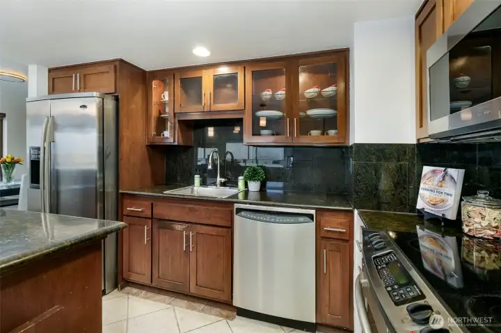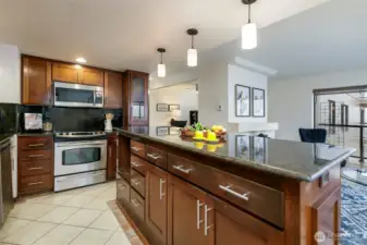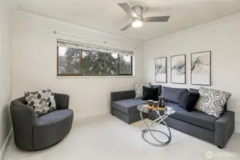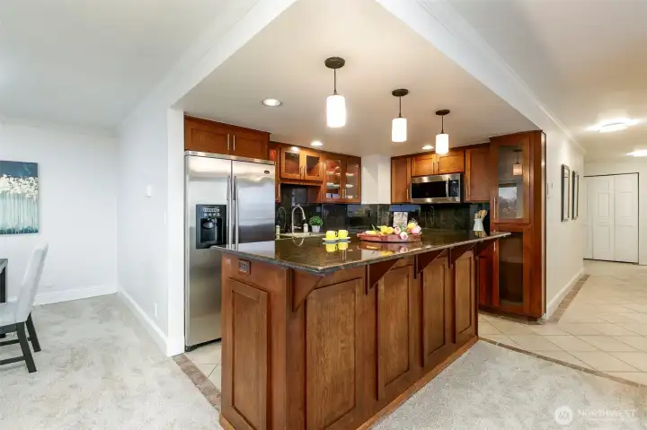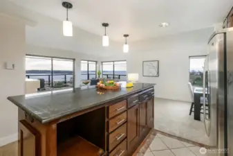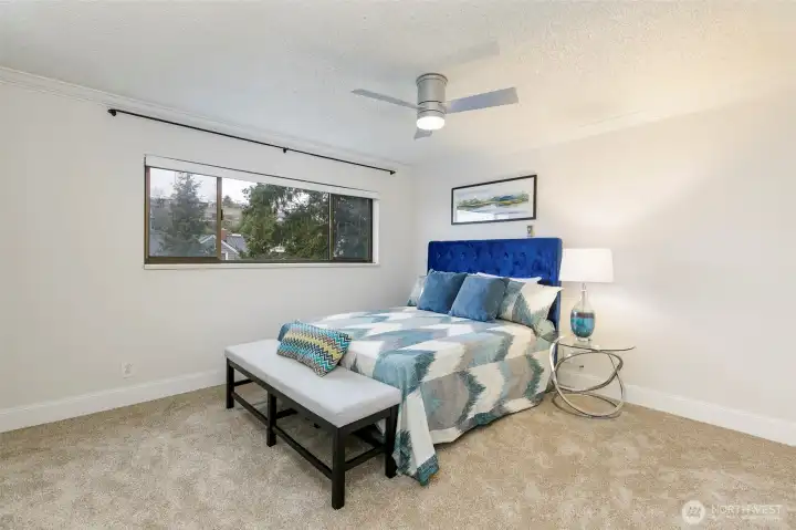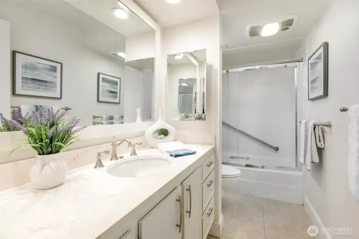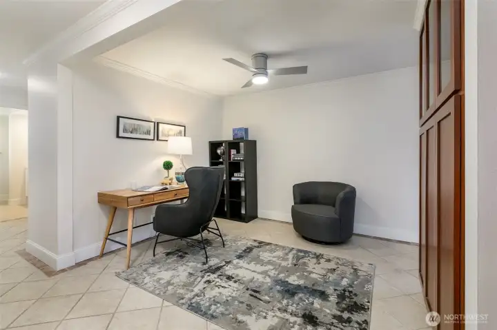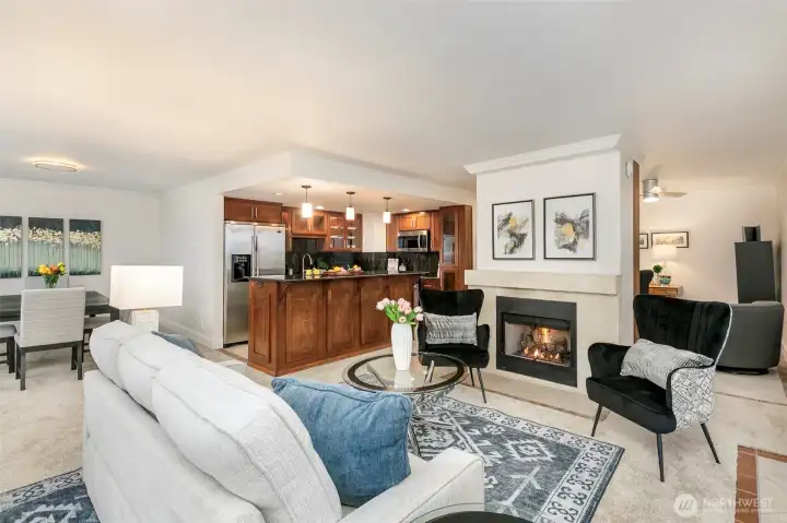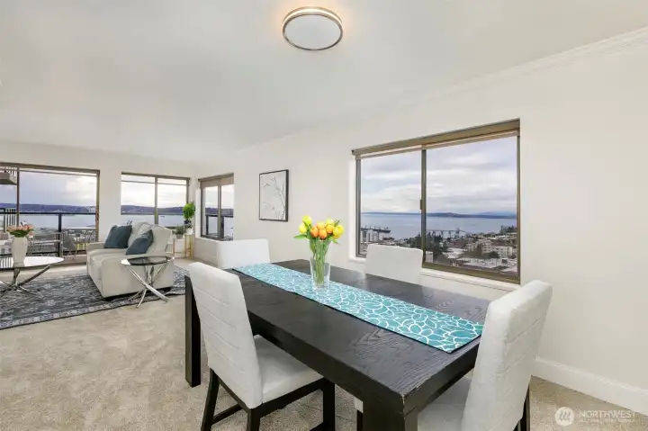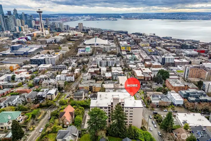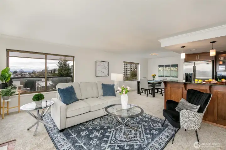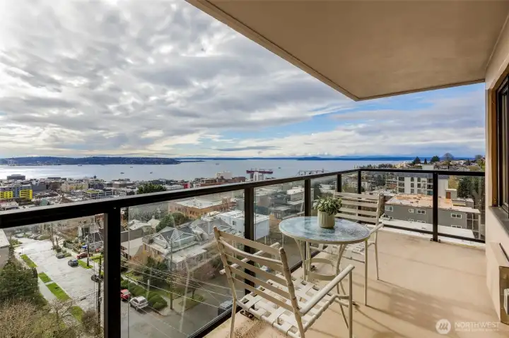This corner residence in one of Queen Anne’s premier concrete and steel buildings showcases breathtaking views of Puget Sound and the Olympic Mountains from the main living and dining areas. Expansive windows and a beautiful private deck open to the skyline and passing ships, an ever-changing backdrop for morning coffee or sunset evenings.An exceptional sense of calm defines the home. Sunlight fills the main living areas throughout the day, while the north-facing bedrooms provide a quiet, comfortably retreat.The floor plan offers distinct yet connected spaces. The kitchen features slab granite and bar seating, flowing into formal dining and an expansive living room designed for gathering. Just off the main living area, a substantial multi-purpose room adds rare flexibility, ideal as a home office, den, media room, or study space. The spacious primary suite includes a private bath, and a second full bath serves the additional bedroom. Air conditioning, secure deeded parking, private storage, and ample guest parking complete the offering.Located on Queen Anne, just blocks from Seattle Center, with easy access to museums, the Space Needle, Climate Pledge Arena, dining, shopping, and downtown. Iconic views paired with immediate access to the best of the city.
