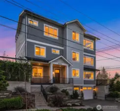 Sitting high off the street with sweeping views of Green Lake, the Skyline & the Olympics this centrally located 2019 custom built Green Lake home features high end finishes, large spaces & a gorgeous ADU perfect for multi-generational living, guests or rental income. Custom everything in this home from the high end kitchen finishes, built in cabinets/desks/mudroom, a 4-level elevator & added shop off the 2-car garage - everyone gets what they want here! The vaulted ceilings on the top level allow for supersized windows filled with southern light drenching the living room, dining room, kitchen, play space, walk in pantry & half bath. One floor down are the 4 main home bedrooms including a primary suite w/ views of the lake, fireplace, ensuite bath w/ heated floors and two walk in closets, a 2nd full bath & laundry are also on this level. The entry level features a laundry/craft/office space, a second office or guest space, a full bath & the 1 bed, 1 bath ADU with separate entrance off 80th. The ADU has high end finishes with granite slab, fireplace, custom cabinets, heated bathroom floors, large walk in closet and laundry hookups. The lower level has a large two car garage (w/EV hookup) with extra storage/shop, a mudroom with custom built ins & a temperature controlled wine cellar. With a gorgeous roof deck (& solar panels), a patio/grass area and separate garden space off the ADU, there is plenty of outdoor space to enjoy. A block to Green Lake & shops- this home has it all.
