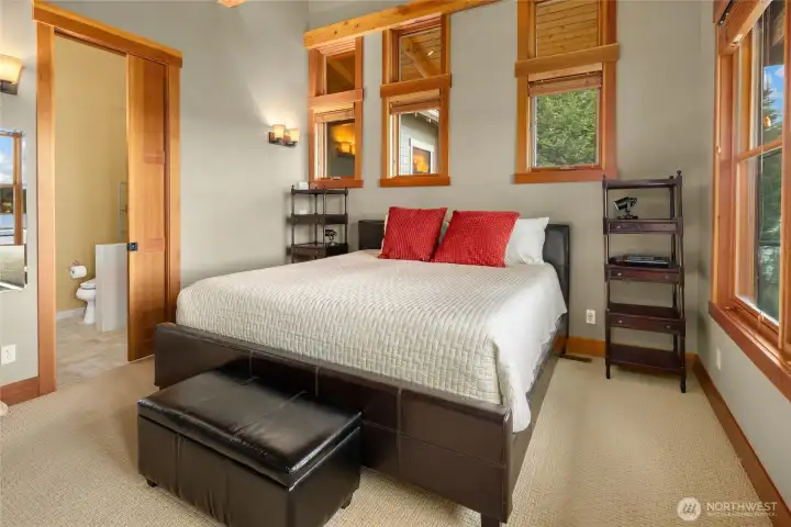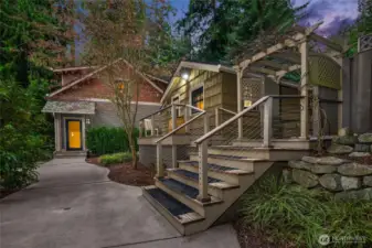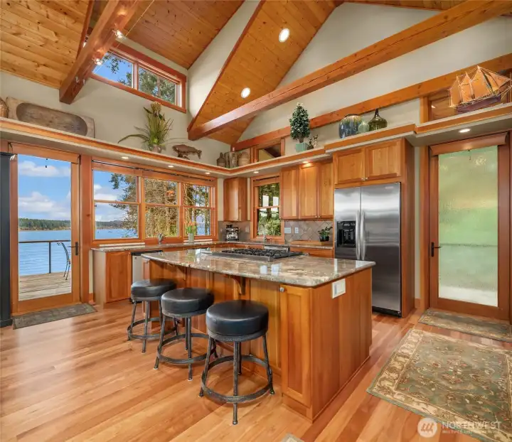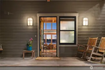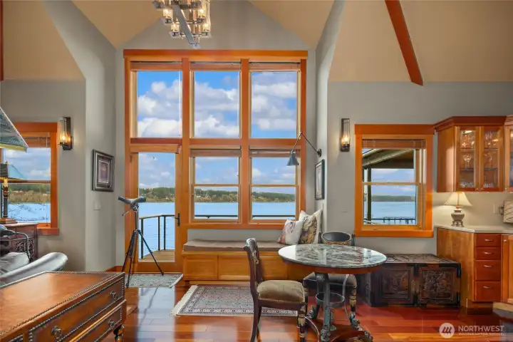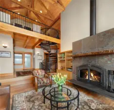 A rare Sandy Hook waterfront residence with 204 feet of Puget Sound shoreline in one of Poulsbo's most sought-after communities. Held by one family for decades, the property found new life in 2009 when the custom home was built, blending elevated NW contemporary warmth with thoughtful craftsmanship throughout. Soaring ceilings and generous windows in the great room bring the Sound and views of Mt. Rainer into daily life, creating a space that feels both grand and grounded. A library wing carries the same dramatic volume, while a main-floor primary suite ensures effortless livability. At the heart of the home, a hand-forged spiral staircase features a seamless interior rail with no support posts, a masterful centerpiece connecting the upper loft with additional storage, a fully insulated media room, and a wine cellar. The property offers exceptional versatility beyond the main residence. A private cottage with full bath, AC, and sauna provides a guest retreat or personal escape. Above the extended two-car garage, an age in place apartment includes a full bath, bedroom, living room and its own central vac system, ideal for extended living, visitors, or remote work. Nestled near the shoreline, a charming boathouse serves as a quiet place to connect with the eagles, seals, and marine life that call this channel of the Sound home. Shaped by two generations' love for this setting, this is a home with soul, story, and a lifestyle that is simply hard to replicate.