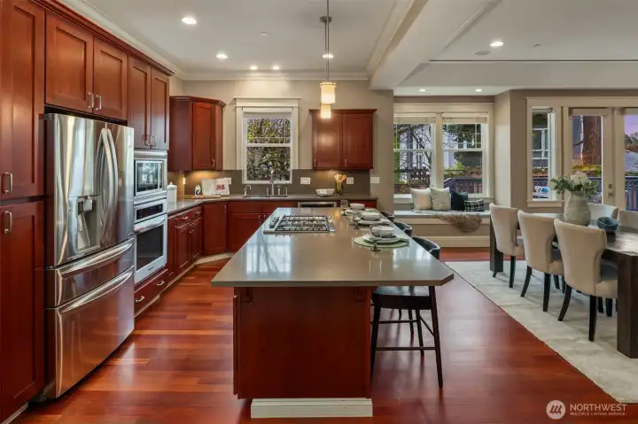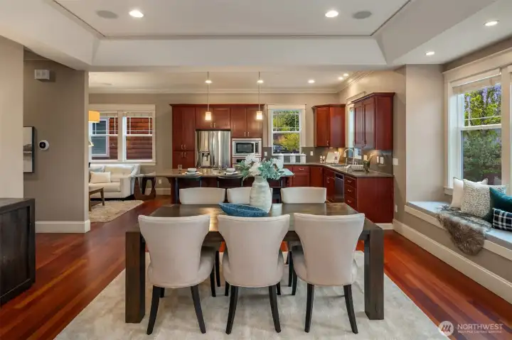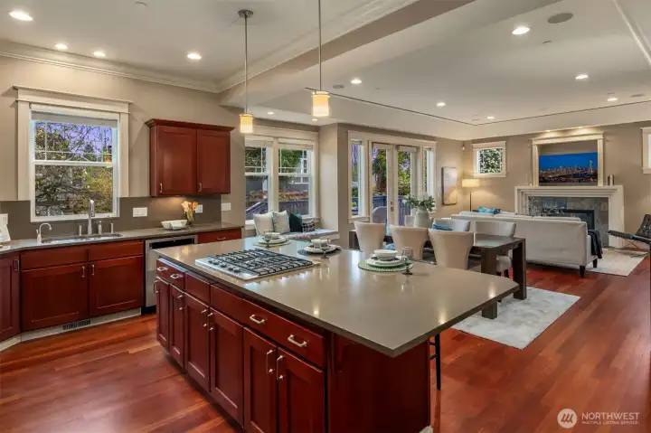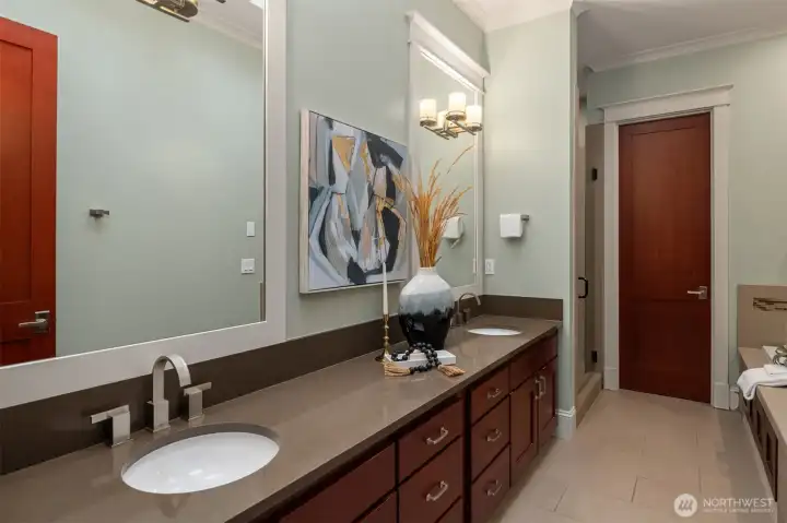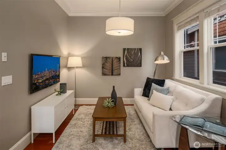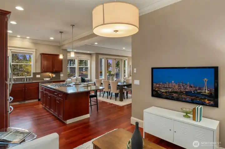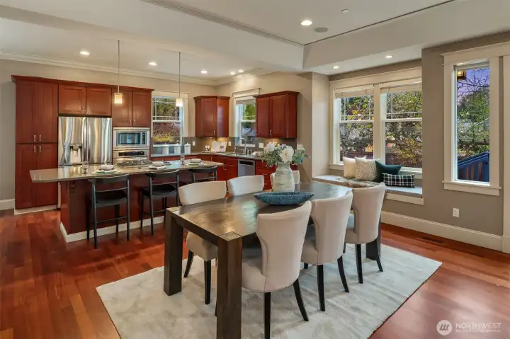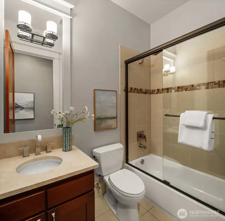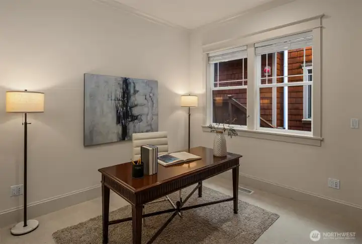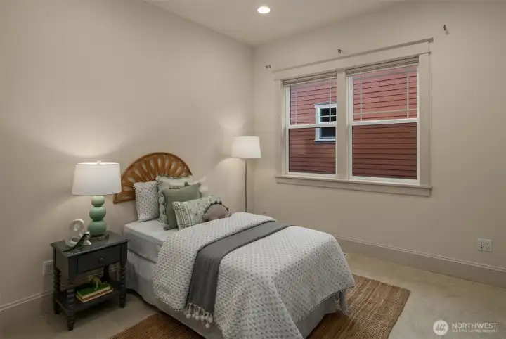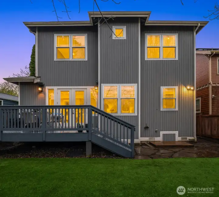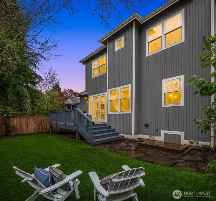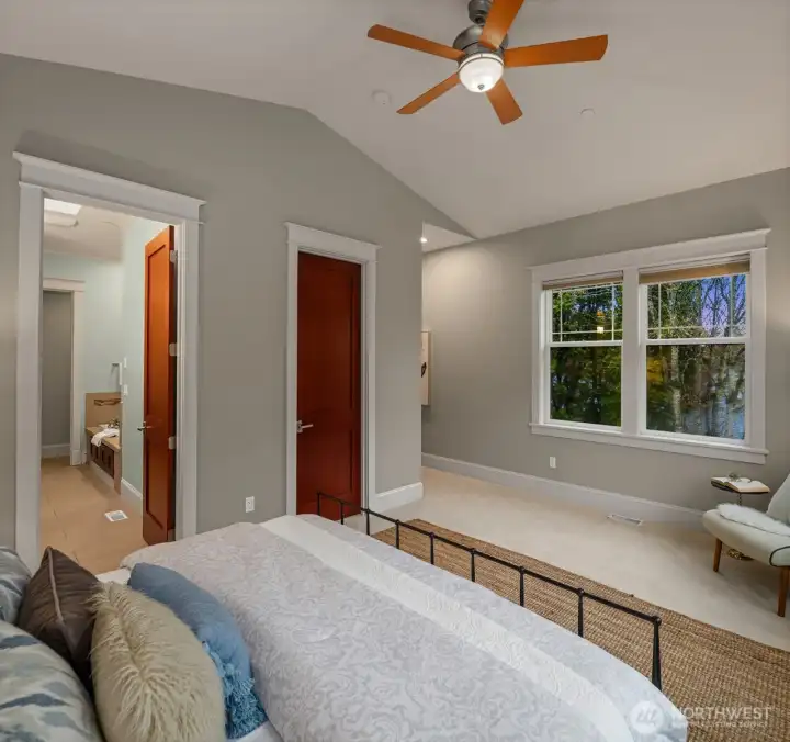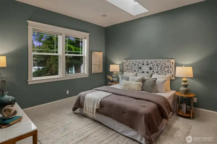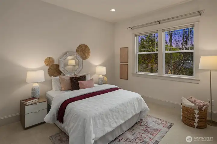Signature modern Craftsman in desirable View Ridge, set back on a quiet private lane of six homes. Built in 2010, this thoughtfully designed residence offers an ideal floor plan with soaring 10’ ceilings, abundant natural light, and seamless flow for everyday living and entertaining. The main level features a spacious great room, Brazilian hardwood floors, and a chef’s kitchen with stainless appliances and slab granite countertops. Plus, a rare main-floor bedroom and full bath, perfect for guests or a home office. Upstairs, retreat to a generous primary suite with spa-like bath, along with three spacious bedrooms. French doors open to an expansive deck and fully turfed backyard, offering privacy and low-maintenance outdoor living with room to play, relax, or entertain. Enjoy year-round comfort with central A/C. Ample parking includes an oversized two-car garage with EV charging, plus additional driveway parking, rare for the area. A true blend of craftsmanship, comfort, and functionality close to parks, schools, and city conveniences.