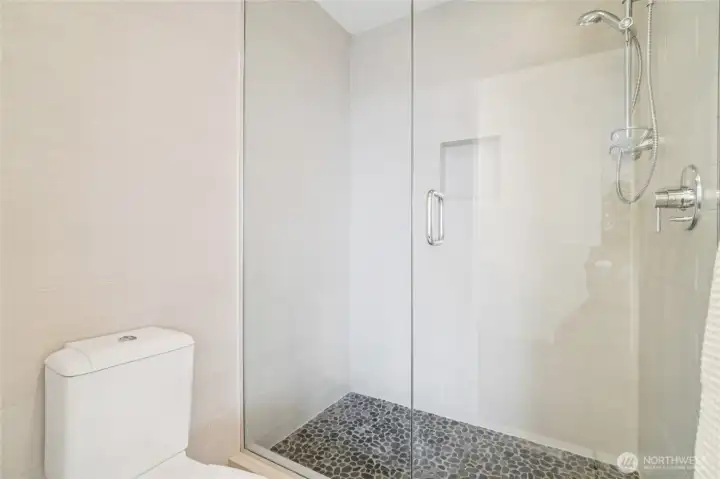 Experience a thoughtful blend of architectural style and urban convenience in this uniquely designed 1,590-square-foot modern townhouse. Defined by its efficient three-level layout, this home offers an elevated living experience on a 1,138-square-foot lot with no HOA. The open-concept main floor is characterized by natural light, where floor-to-ceiling windows frame a spacious living area that flows seamlessly into a contemporary kitchen and dining space—ideal for both daily living and entertaining. Practical luxury is integrated throughout, from the ambient-heated concrete floors powered by a high-efficiency tankless water system to the privacy of three dedicated bedroom suites, each featuring its own private bath. While the primary suite serves as a serene retreat with an ensuite bath and walk-in closet, the lower-level suite offers a private patio that provides versatility for guests or a quiet home office. Outdoor living is expanded via rooftop access to two private decks, offering panoramic views of the Cascade and Olympic mountains and the Bellevue skyline. Complete with a covered carport, proximity to the coveted language-immersion programs at Beacon Hill International School, and easy access to Link light rail and Metro bus, this residence perfectly balances modern design with a prime location.