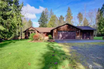 A private oasis in the woods set on five usable acres, offering space, flexibility, and everyday convenience. The gated entry creates a welcoming approach while enhancing privacy. A newer roof and generator wiring add practical value and peace of mind. Inside, vaulted pine ceilings, exposed beams, and detailed millwork create warmth and character. The light-filled great room is anchored by a wood-burning fireplace and flows seamlessly into the kitchen and dining areas, making the layout ideal for both daily living and gatherings. The island kitchen is designed for function, featuring double ovens, generous counter space, and a walk-in pantry for ample storage. The primary suite continues the vaulted ceilings and offers direct access to the backyard. The spacious 5-piece bath includes tile finishes, a soaking tub, separate shower, and walk-in closet. Secondary spaces provide flexibility for guests, work, or hobbies. Outdoor living extends naturally from the interior, with access from both the great room and primary suite. The property includes a three-car attached garage, designated garden space, and room to enjoy the setting. No HOA oversight allows for greater freedom in how you use and enjoy your property.