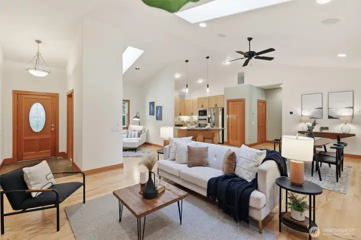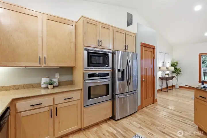 Perfect 3 bed, 2 bath, one-level living in charming, historic Coupeville! Located just inside city limits as low density residential, this beautifully maintained home offers privacy & convenience. Step inside to an inviting open-concept 1,861 square foot design where vaulted ceilings & warm maple floors create a bright welcoming feel. Spacious great room (with propane fireplace!) flows seamlessly into the kitchen featuring granite counters, maple cabinetry, ample storage & stainless-steel appliances. Thoughtfully designed layout includes a generous primary suite on one side + two well-appointed secondary bedrooms on the other – each area having a full bathroom. Primary suite features custom closet system in large walk-in closet, plus French doors out onto the large back deck. Unwind on the deck or screened-in porch overlooking a large fully fenced yard w/ raised garden beds. Peaceful, private & perfect for gardening and relaxing evenings watching the deer. Seasonal peekaboo water views of Penn Cove. Graveled RV parking alongside garage. Large garage includes well setup attic storage. Home is equipped with heat pump (AC to stay cool in summer!), security system & garden shed. Recent updates include new heat pump (2024), refrigerator (2024) and washer/dryer (2023). Just a stone’s throw from Price Sculpture Forest with its enchanting trail system. Turnkey, comfortable & ready for you. This is Whidbey Island living at its finest!