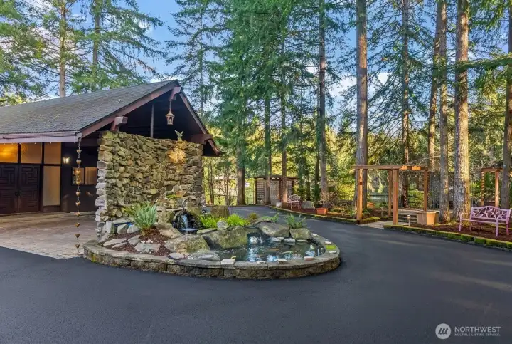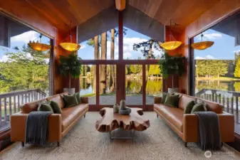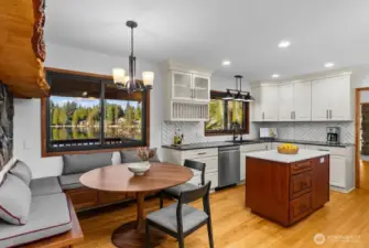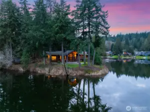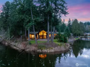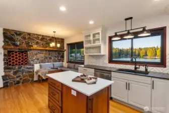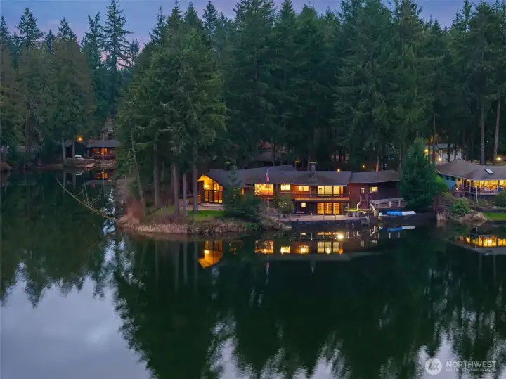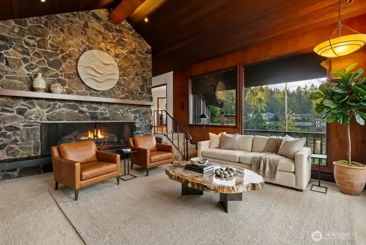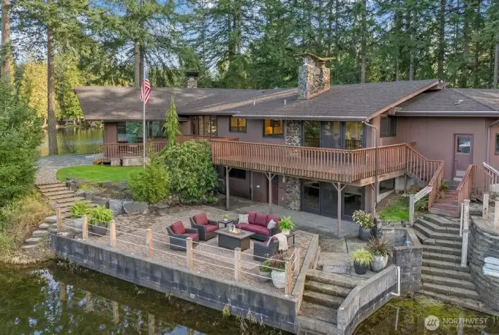 Set on a rare .67 acre point lot with 270+/- feet of no bank frontage, this Ken Lake retreat captures water views in nearly every direction. Designed in a striking Northwest Contemporary style, the 3,400+ square foot daylight rambler features 5 bedrooms and 4 baths, soaring 20 foot beamed ceilings, and a dramatic brick fireplace with raised hearth. Floor to ceiling windows in the living and dining areas frame the lake and fill the home with natural light, while gas fireplaces with custom live edge mantles add warmth and character. The kitchen offers custom cabinetry and storage, a charming Bavarian corner nook, and seamless flow to gathering spaces overlooking the water. The primary suite enjoys tranquil views and an updated bath. A permitted chair lift, copper sinks, new carpet and paint complement thoughtful improvements including custom pavers, refreshed water and gas lines, and Andersen windows and sliders. Meandering paths lead to ponds, gazebos, a greenhouse, craft shed, fully fenced, fire pits and a lakeside patio wired for a hot tub. Swim, fish, kayak, or simply relax and watch local wildlife from your own shoreline. Community parks and a swim beach enhance this in town lakefront lifestyle, all tucked into a quiet cul de sac setting in Ken Lake. It's an entertainers dream! Don't let this go! (*Some rooms are virtually staged*)