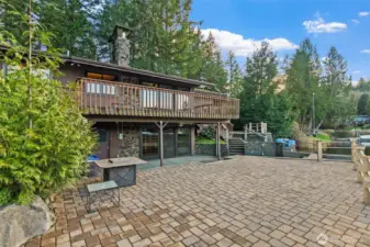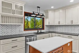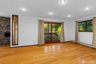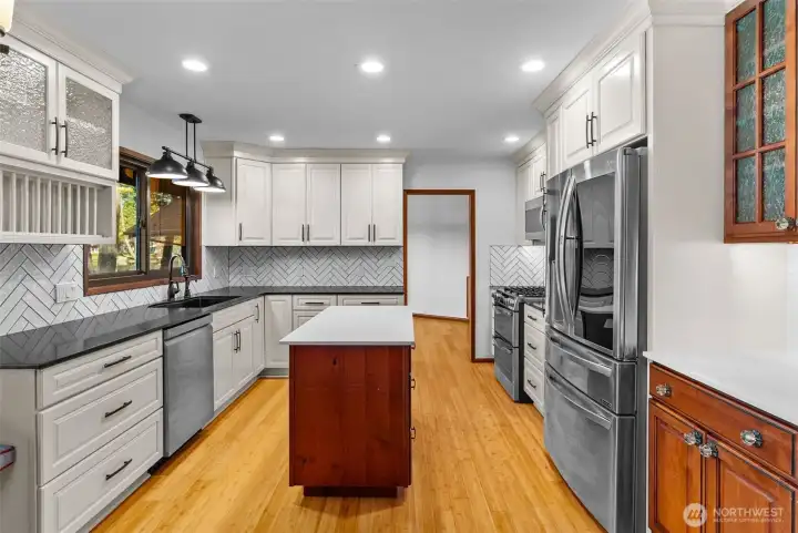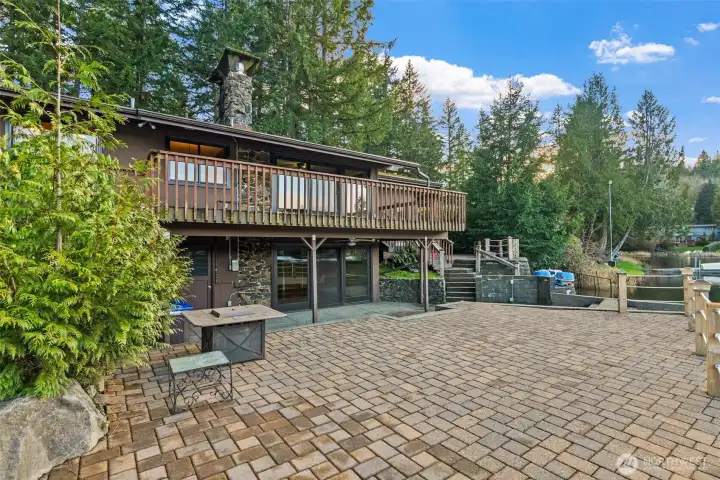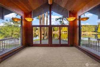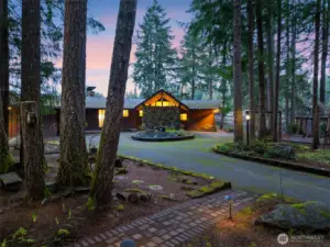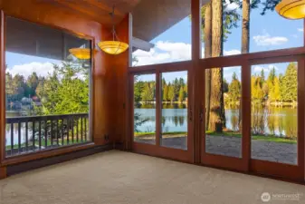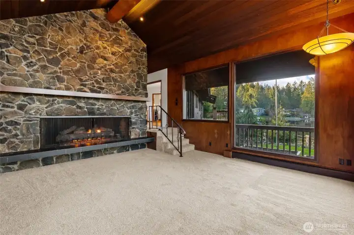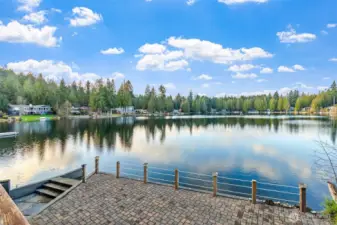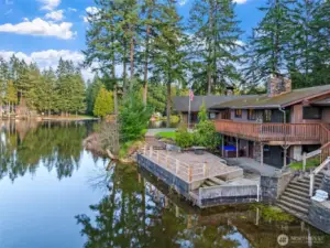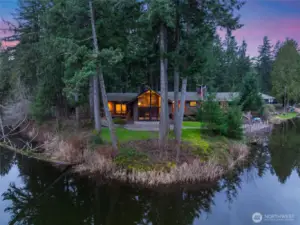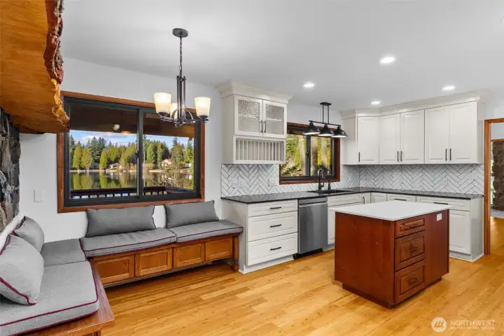 Set on a rare .67 acre point lot with 270+/- feet of no bank frontage, this Ken Lake retreat captures water views in nearly every direction. Designed in a striking Northwest Contemporary style, the 3,400 square foot daylight rambler features 5 bedrooms and 4 baths, soaring 20 foot beamed ceilings, and a dramatic brick fireplace with raised hearth. Floor to ceiling windows in the living and dining areas frame the lake and fill the home with natural light, while gas fireplaces with custom live edge mantles add warmth and character. The kitchen offers abundant cabinetry and storage, a charming Bavarian corner nook, and seamless flow to gathering spaces overlooking the water. The primary suite enjoys tranquil views and an updated bath. New carpet and paint complement thoughtful improvements including custom pavers, refreshed water and gas lines, and Andersen windows and sliders. Meandering paths lead to ponds, gazebos, a greenhouse, Craft shed, fully fenced and a lakeside patio wired for a hot tub. Swim, fish, kayak, or simply relax and watch local wildlife from your own shoreline. Community parks and a swim beach enhance this in town lakefront lifestyle, all tucked into a quiet cul de sac setting in Ken Lake. Don't let this go!