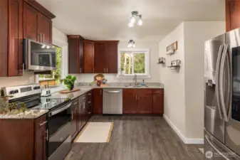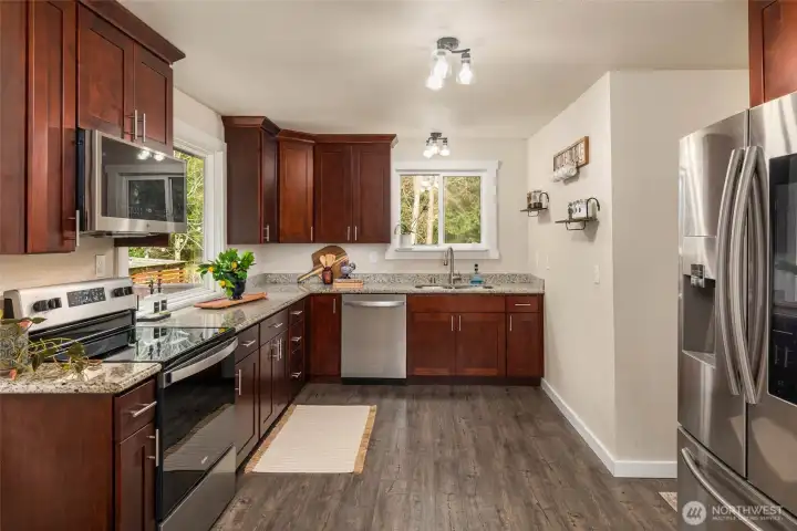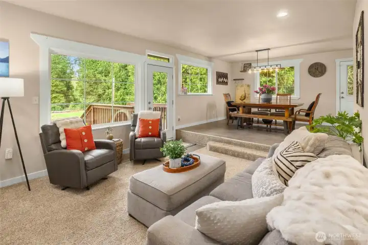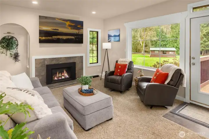 Nestled on 3 private acres on Camano Island, this beautifully updated Northwest retreat offers the perfect blend of privacy, space, and charm. A long private drive leads to a picturesque lodge-style home surrounded by towering evergreens and open lawn areas, creating a peaceful setting just minutes from beaches, parks, and boating. Inside, the home features a bright open floor plan with large windows, updated flooring, and warm wood accents that create a welcoming Pacific Northwest feel. The spacious kitchen offers granite counters, stainless appliances, rich cabinetry, and ample prep space, flowing seamlessly into the dining area and inviting living room with cozy fireplace. Multiple living spaces provide flexibility for home office, guest rooms, or bonus areas, while the generous primary suite includes a large walk-in closet and updated bath. Step outside and enjoy true Camano Island outdoor living with an expansive deck, firepit gathering area, and sprawling lawn perfect for entertaining, gardening, or simply enjoying the quiet natural surroundings. The level acreage offers room for shop space, RV parking, hobby farming, or future expansion. Located in a sought-after area of Camano Island with easy access to state parks, beaches, hiking trails, and boating, this rare acreage property offers privacy, versatility, and the relaxed island lifestyle just over an hour from Seattle.