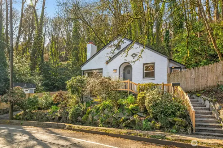 Nestled up above the street backing up to Interlaken Park. A graceful fairytale tudor. The main level features hardwood floors, wood burning fireplace, built-ins and coved ceilings. Two bedrooms one that opens out to the fully fenced back deck. Updated kitchen with subzero fridge and counter seating. New carpeting and paint downstairs. Lower level has a 3/4 bath and non-conforming 3rd bedroom, kitchenette, family room, bonus laundry room and plenty of storage. Large deck with outdoor fireplace, room for garden, dog run and shed. An in city oasis with easy access to Capital Hill, Arboretum and U-Village great for commuting on the Connector to Microsoft.