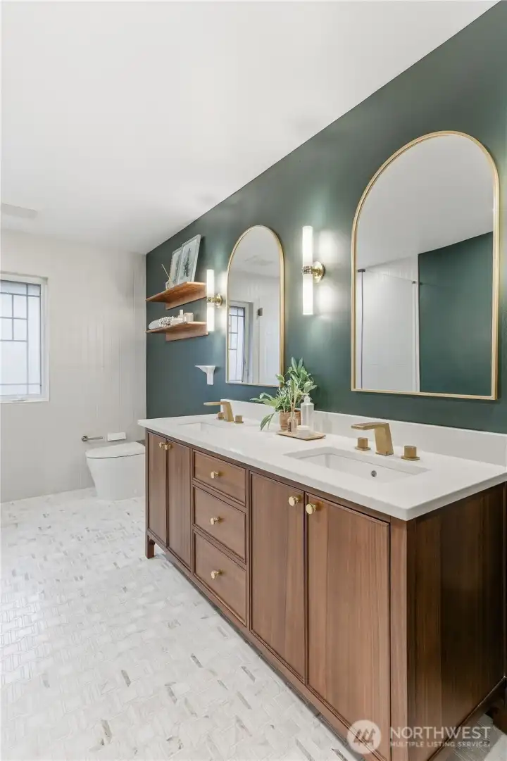 Welcome to luxury living in the Meridian Valley Country Club! This impeccably maintained home features an inviting layout and high-end finishes. The social chef’s kitchen flows into the family room, perfect for hosting dinner parties. Tons of natural light in the living room with astounding Mount Rainier views. Large primary suite has stylish remodeled bath boasting heated Italian marble floors. Second full bath on the main was also remodeled in 2025. The lower level offers flexibility with a spacious family room, gas fireplace, two massive bedrooms, one of which makes a great home gym, and an updated 3/4 bath. The home sits on a quiet cul-de-sac with amazing views. Entertain friends on the back deck, where old-growth cedars provide natural cooling during summer months. Car and golf enthusiasts will love the huge 3-car garage, featuring a dedicated fourth door for golf cart parking. A true PNW gem!