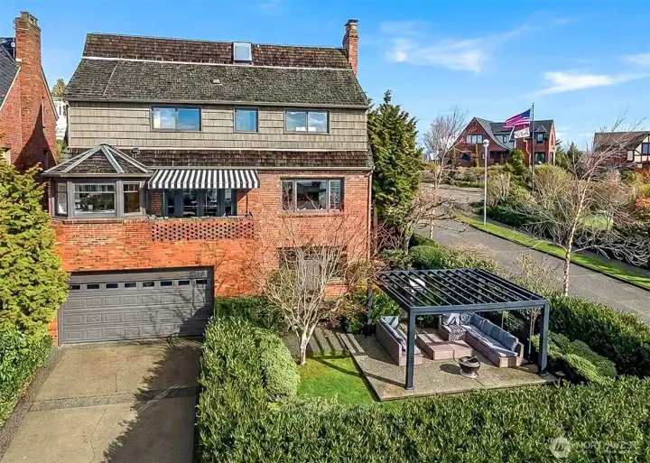 Nestled in the heart of Magnolia’s coveted Carleton Park, this 1932 English Tudor is a rare blend of historic integrity and breathtaking natural beauty. Framed by mature Birch, Cherry, and Redwood trees, the home offers a private, storybook setting just moments from transit and local amenities. Unobstructed views of Puget Sound, Mt. Rainier, and the Olympic Mountains protected by acquired air rights, create a truly irreplaceable backdrop. Inside, sun-drenched living spaces showcase exquisite original craftsmanship, including Mahogany entry doors, pocket doors, corner cabinetry, and pristine leaded glass. Refinished oak floors glow throughout. A charming under-stair “fort” adds a whimsical touch, while two laundry stations, one on the second floor and a new full-size set in the remodeled basement, bring everyday ease. The primary suite features a built-in Mahogany dresser, spa-inspired bath with soaking tub, and skylight. Dual-zone HVAC provides year-round comfort, including A/C upstairs. The lower level offers a luxe guest suite with surround sound, full bath, and dedicated fitness room. Home has two laundry rooms for convenience. Beyond wrought iron gates, curated garden “rooms,” a secluded side yard, expansive patio, and structural retaining wall create a fully enclosed sanctuary. A newly scoped and re-piped sewer line to the city connection completes this exceptional offering.