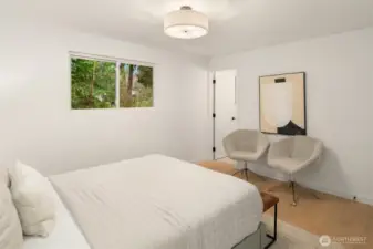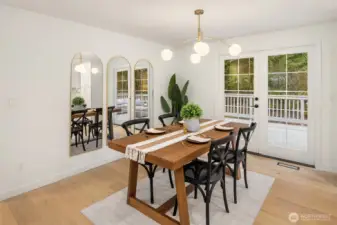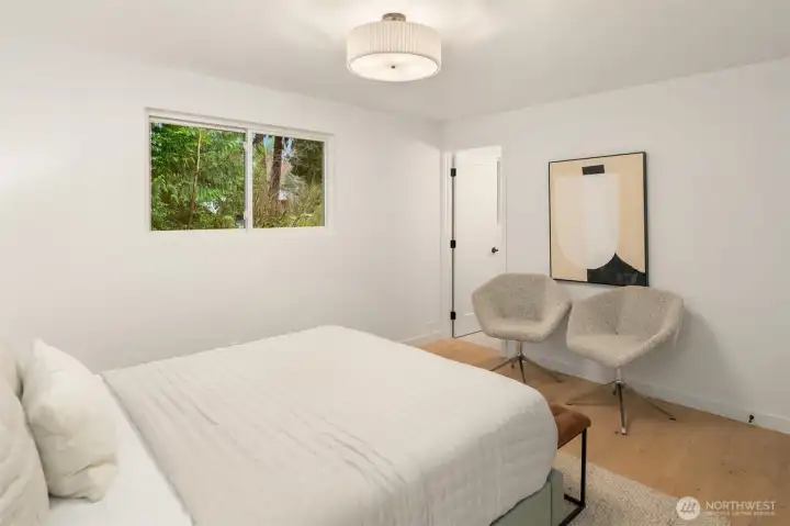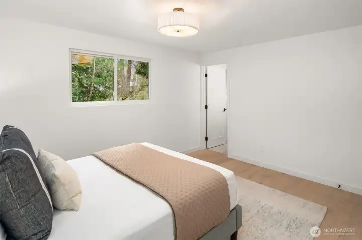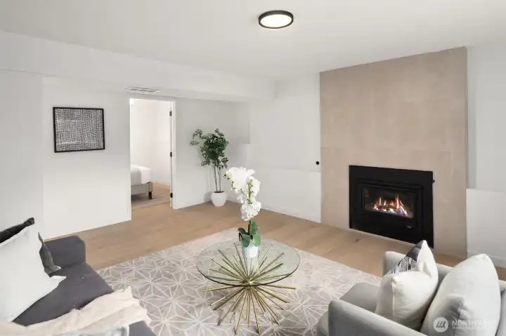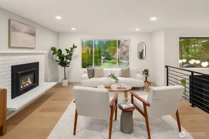 Completely reimagined home with DADU potential on 12,450 sq ft lot in highly sought-after South Rose Hill . Tucked away at the end of a private drive, this beautifully appointed residence offers style, comfort, and functionality throughout. The main level showcases white oak hardwood flooring, a stunning high-end kitchen featuring quartz countertops, shaker-style cabinetry, and stainless steel appliances. The open-concept living and dining areas are anchored by a cozy gas fireplace and provide seamless access to the outdoor deck, making it ideal for entertaining and enjoying warm summer evenings. The spacious primary suite includes a luxurious bath with tile floors and a custom surround. Two additional bedrooms and a full bathroom complete the main floor. Upon entering the lower level you'll find a large family room ideal for gatherings or movie nights, an additional bedroom/flex space, a three-quarter bath, and a dedicated laundry room. Fully finished two-car garage adds convenience and practicality. Located within the top-rated Lake WA school district and offering an easy commute to both downtown Redmond and Kirkland and tech hubs. This home is just minutes from highly rated restaurants, parks, and everyday amenities.
