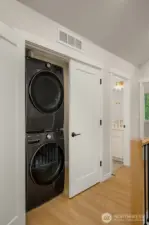 Beautiful modern new construction by Blue Ridge Homes, offering 2 bedrooms and 2.25 baths in a bright, thoughtfully designed layout that blends contemporary style with everyday functionality. Clean architectural lines, abundant natural light, and seamless flow create an inviting atmosphere throughout. The main level is anchored by a sleek chef’s kitchen featuring quartz countertops, stainless steel appliances, modern cabinetry, and an expansive island, perfect for gathering or casual dining. The kitchen flows effortlessly into the spacious living and dining areas, while sliding glass doors extend the space to a private patio, ideal for summer evenings or morning coffee. Upstairs, the serene primary suite offers a generous walk-in closet and spa-inspired ¾ bath with designer finishes. The second bedroom is well-sized and versatile, perfect for guests or a home office, adjacent to a full bath. Upper-level laundry and a designated EV-ready parking space add everyday convenience. Ideally located near Downtown Kirkland, waterfront parks along Lake Washington, top-rated Lake Washington schools, tech campuses, shopping, dining, and major commuter routes.