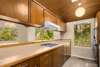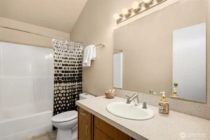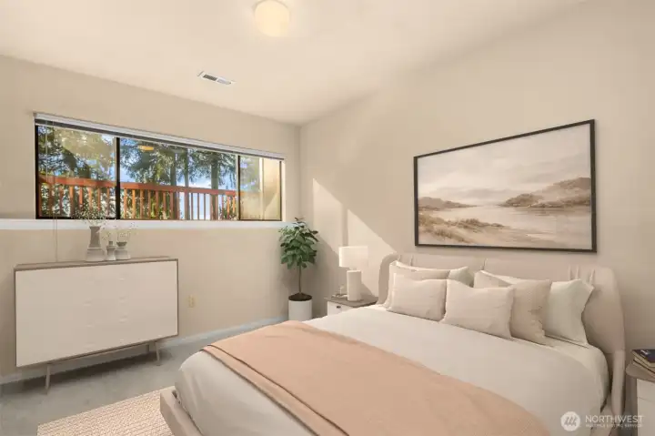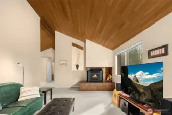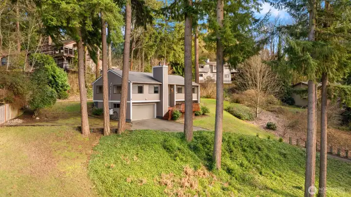 Welcome to vibrant downtown Woodinville, where excellent restaurants, shopping, wineries, parks & trails abound! This 2,290 sq. ft. 3-bedroom /3 FULL bath home with true Northwest contemporary, vaulted-ceiling architecture offers an elevated perch enhancing privacy and security while creating a sense of separation from the street and neighboring properties. Southwestern exposure fills the home and property with natural light and showcases panoramic, peekaboo valley and Olympic Mountain views. The flexible floor plan features a main floor with: fireplace-warmed living room that takes in the views; an efficient contemporary-meets-retro kitchen w/sleek lines adjacent to space for dining/family room w/slider to the backyard; a flex room for den/office/dining or kitchen expansion; primary ensuite w/full bath + large walk-in closet; and a second bedroom and full bath. Downstairs you will find the 3rd bedroom, spacious family/rec room, large utility/laundry room and full bath. Enjoy a southwest-facing sun deck, newer 96% efficient gas furnace, AC/mini split for year-round comfort & brand new gas water heater. The sun-filled yard is perfect for those with a green thumb and a love of peace & quiet! This property is on sewer and likely ADU compatible (buyer to verify), offering potential for guest space or income opportunities. Served by excellent Northshore School District and just mins. to Costco, the tech corridor, and 1.5 blocks to the future Trader Joe’s! Pre-Inspected.