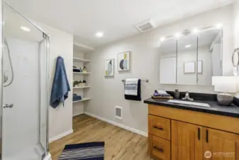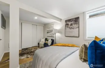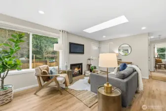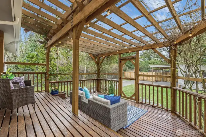 Tired of cookie cutter attached townhomes on postage stamp lots? This home is anything but. It lives like new construction after the 2024 rebuild but sits on a huge, fenced lot affording privacy and room for play. Large windows and multiple skylights look out to the sky and greenery and bring in tons of light. The open floor plan makes gatherings feel both intimate and spacious with an electric fireplace for warmth and ambiance. French doors open to an expansive deck originally imagined as a catio but makes a covered outdoor space to enjoy year round. Across the grassy yard is a large outbuilding ready to be finished as a yoga studio, home office, gym or workshop. Two bedrooms and a bath complete the main level. Downstairs finds a fully finished space with a large bedroom suite, recreation area with office nook and mini kitchen and storage room. This floor can easily be converted to a separate apartment. Rare garage parking, parking pad and space in front to accommodate multiple vehicles. Heating and cooling with Ductless MiniSplits keeps the temperature comfortable all year long. Three blocks from the InterUrban Trail, Greenwood amenities, multiple transit options and a short trip to Northgate Mall. It is time to make it yours.
