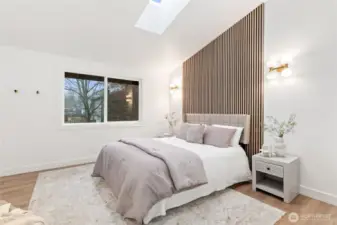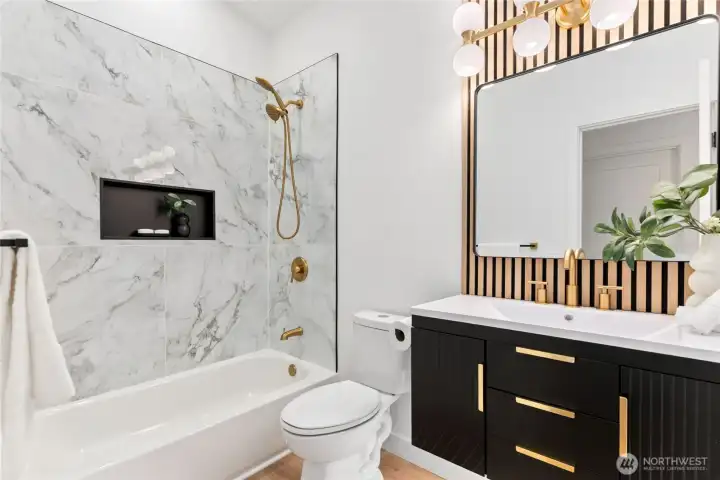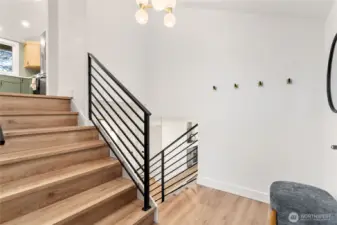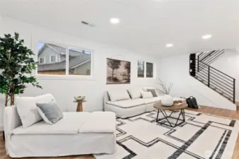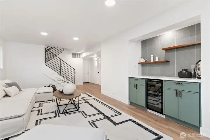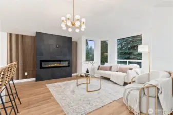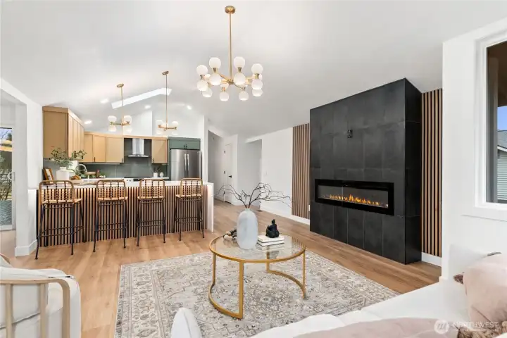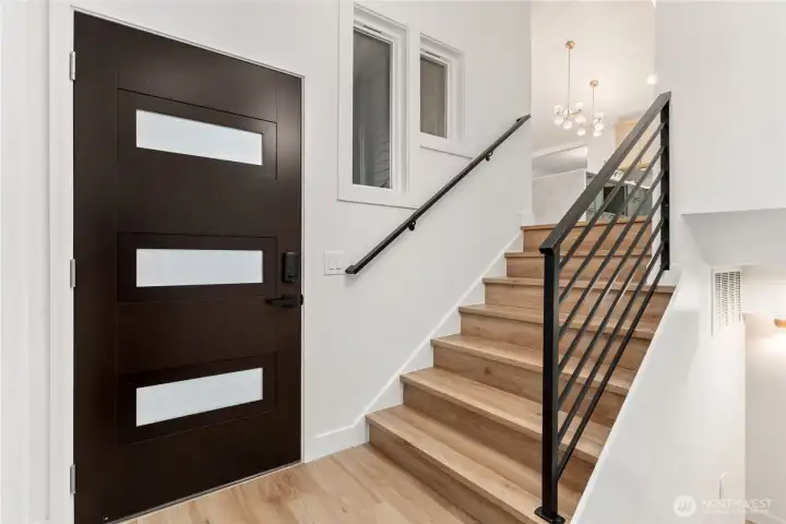 Absolutely stunning luxury residence in the heart of Lynnwood, designed to impress with elevated finishes and sophisticated modern style. A dramatic illuminated entry with custom wrought iron railing and cedar-accented covered porch sets the tone for the elegance within. The light-filled interior showcases soaring vaulted ceilings, curated designer lighting, and a seamless open-concept layout ideal for upscale living and entertaining. The chef’s kitchen is a showpiece, featuring sleek quartz countertops, a statement waterfall peninsula, two-tone custom cabinetry, and premium stainless steel appliances—blending beauty and function. The refined living room centers around a contemporary electric fireplace with custom accent wall, flowing effortlessly into the formal dining space and expansive Trex deck with designer railing, creating the perfect indoor-outdoor experience. Upstairs, the luxurious primary suite offers vaulted ceilings, skylight, and spa-inspired bath with custom shower and floating vanity. Additional bedrooms and a beautifully appointed bath with floating vanity and elegant finishes provide comfort and style.The lower level features a sophisticated media/family room with custom bar and beverage cooler, flexible bonus space, guest bedroom, full bath, and oversized laundry. Fully fenced yard. Minutes from Alderwood Mall, premier dining, and major tech commuter routes, this exceptional home delivers the lifestyle today’s luxury buyer demands. Must See TODAY!