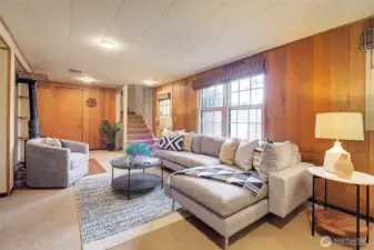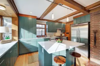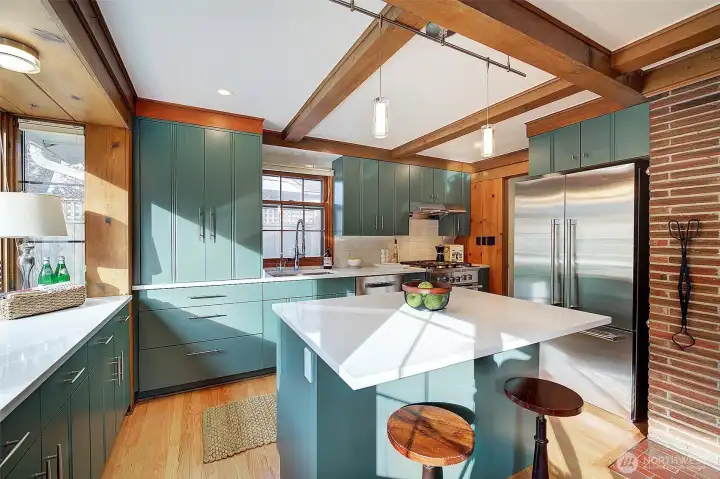 This special mid-century modern home exudes charm from the garden to the home's unique interior. Wood boxed beam ceilings, grass mat walls & newly refinished wood floors greet you when entering home. Recent remodel allows for built-in cabinets in both the living rm & kitchen featuring plenty of storage. Kitchen cabinetry allows for quick & easy access to the cooks' tools while accessing Bosch and Fisher Paykel appliances including a dual fuel range featuring a gas cooktop & electric oven. Full height pantry & small mudroom off the kitchen. A corner gas fireplace w/glass drs on both faces allows for a cozy ambiance seen from both the living rm & kitchen. French doors lead into a lovely space for a traditional dining room, office or library. Down the hall, past the full bath enroute to the lrge primary bedrm w/wood burning fireplace & ensuite ¾ bathrm featuring heated floor. The second bedrm off the hallway features 12' long closet to accommodate a large wardrobe & a second closet ideal for holding more clothes or storage. Lower floor has a ¾ bath, family room w/gas stove & access to the fully fenced back garden w/wood burning fireplace & over-sized garage. Additional parking available in the backyard off an alley that dead ends at property. The professionally planted garden allows for flowering and fragrant shrubs and perennials throughout the year & easy maintenance. Great Maple Leaf neighbored, convenient to parks, stores, schools, bus lines & Northgate Light Rail.