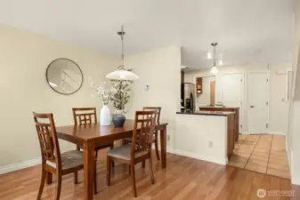 Welcome home to this beautifully positioned end-unit townhome, ideally situated in a sought-after in-town setting. Abundant natural light pours through oversized windows, creating a bright and inviting atmosphere throughout. Enjoy the convenience of a private one-car attached garage plus an additional exterior parking space. Just outside your front door, the first of two private patios offers a warm and welcoming outdoor retreat. Step inside to discover an updated kitchen featuring stainless steel appliances, pantry storage, and easy access from the attached garage — perfect for effortless grocery unloading. The open-concept floor plan is both functional and inviting, with large windows and sliding glass doors that lead to your second private patio, ideal for relaxing or entertaining. The living area showcases a cozy wood-burning fireplace for winter evenings, along with a built-in desk space perfect for working from home or staying organized. A highly desirable main-level primary bedroom provides flexible, one-level living options, complemented by a conveniently located main-floor laundry room. Upstairs, two additional bedrooms and a full bath feature vaulted ceilings and fresh paint, offering comfortable space for guests, hobbies, or a home office. This charming 11-unit community offers open green space and a peaceful neighborhood feel, all while being centrally located with easy access to shops, cafés, parks, and the Seattle ferry. Low HOA dues.
