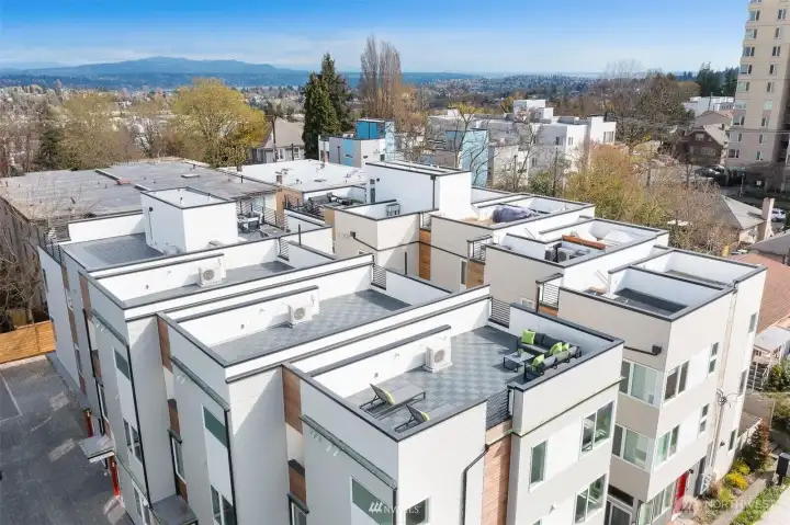 Like new, move-in ready, high-quality, solidly constructed 3-bedroom townhome on a quiet street in sought after North Beacon Hill. Enjoy views of Puget Sound, Cascades, Lake Washington, downtown and Mt Rainer from your private rooftop deck, and delight in instant entertaining with $7k of Crate & Barrel furniture included, consisting of multiple loungers, club chairs, stools, sun umbrella, dining and café tables and chairs. Inside you’ll find soaring ceilings, hardwood floors and ample closets that create an airy, livable environment. Chefs’ kitchen includes gas range with built-in air fryer, refrigerator with built-in water and ice, dishwasher and microwave. Area for large dining table and chairs. Primary suite sanctuary with walk-in closet, spa-like shower, dual sinks and bidet. Easily set up an in-home office large enough for two in one of the two other bedrooms. Add to this, a beautiful wet bar with a sink and refrigerator, private off-street EV charger parking spot, fiber internet and you have a truly rare find. Included and fully functioning is a full-size washer/dryer, premium window shades, security system, smart Lutron lighting equaling $10K in bonus features! Close by is the train station, a 52-acre park, golf course, multiple A-Grade schools, grocery store, eateries, and year-round farmers stand. Sports stadiums and museums are a quick train ride away. With an Excellent Transit score, this area is one of the easiest commutes to downtown, and close to I-90 and I-5.