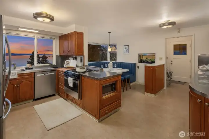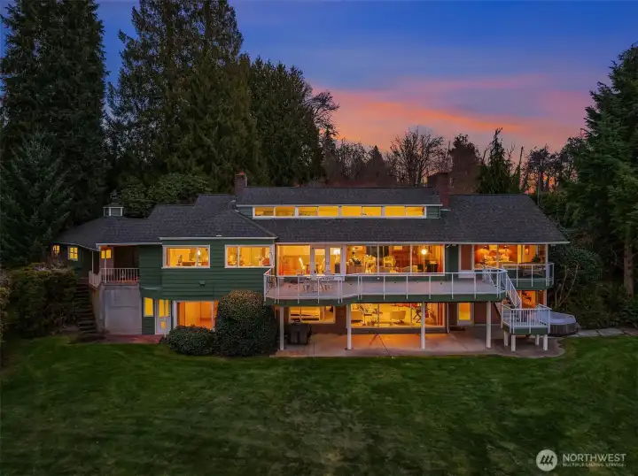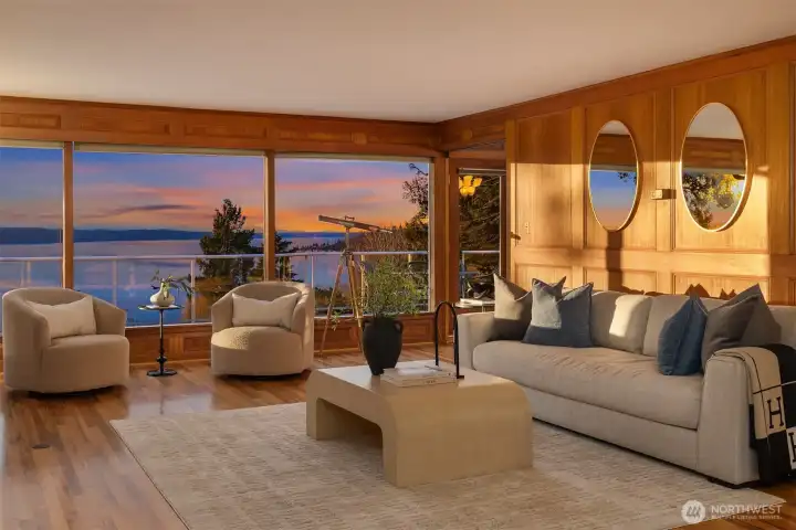Custom-built in 1947 and nestled on 3.2 private, well-maintained wooded acres with century- old cedar and fir, this 5BR/4BA home offers Westerly sweeping views of Puget Sound and the Olympic Mountains. Rich wood floors, mahogany wainscoting, and four fireplaces showcase timeless craftsmanship. Enjoy a spacious deck for sunset entertaining, a light-filled breakfast nook, lower-level bar, and top-floor art studio with built-in desk and water views. Walking distance to shops, gym, and beaches. Backup generator, RV/boat parking, and abundant wildlife—including eagles, hawks, owls, and orca—complete this exceptional property. A rare offering with A' private beach rights and a lush, park-like backdrop—a front-row seat to sweeping Sound views and the rhythms of the surrounding wildlife.
