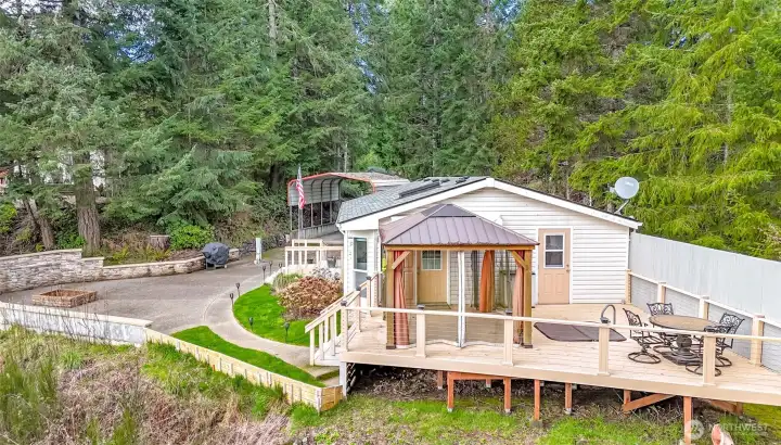 Enjoy breathtaking canal views from this beautifully maintained 3-bedroom, 2-bath home designed for both relaxation and entertaining. Vaulted ceilings and skylights flood the interior with natural light, creating an open and airy feel throughout the main living space.The spacious porch features a covered gazebo and hot tub — the perfect place to unwind while taking in the peaceful setting. Incredible patio area ideal for gatherings, BBQs, and evening sunsets. Need space for toys or guests? The RV-style carport includes partial hookups, offering flexibility and convenience for visitors or travel enthusiasts. Located in a desirable community close to the Hood Canal and Tahuya State Forest!