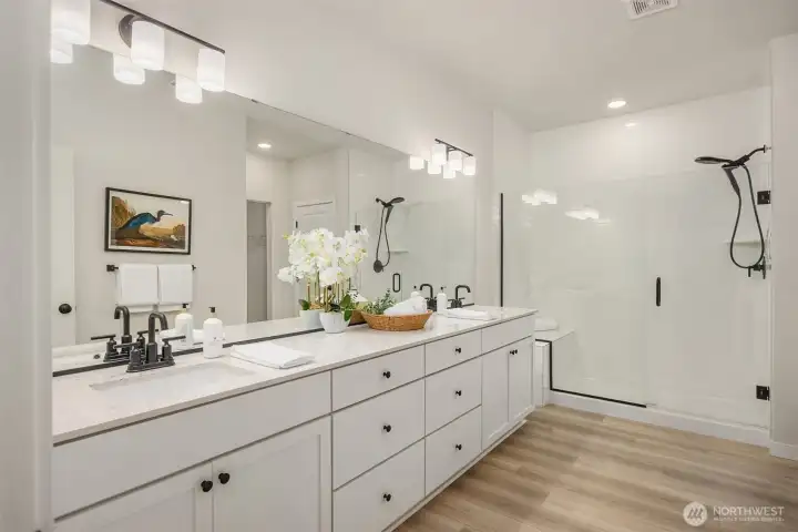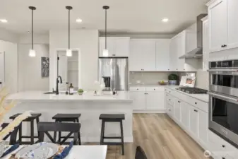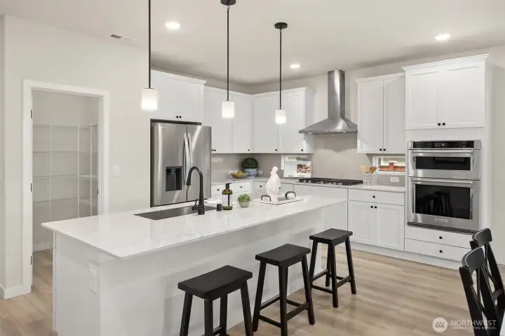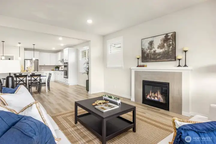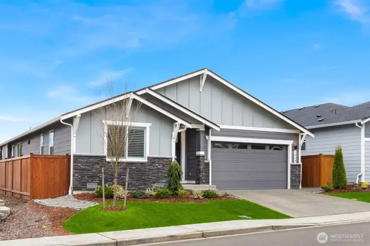 Immaculate Move-In Ready Rambler! This impeccably designed 2,237 SF, 3-bedroom, 2-bath one story home showcases sophisticated living with a light-filled, open-concept layout and soaring ceilings. At the heart of the home, the chef’s kitchen impresses with an expansive island, white soft-close, dovetail cabinetry, quartz countertops, full-height subway tile backsplash, gas cooktop, built-in wall oven, and a generous walk-in pantry. The elegant great room features a gas fireplace and seamless access to a covered outdoor living space, complete with a BBQ gas stub—perfect for effortless indoor-outdoor entertaining or just a place to relax with your morning coffee. Beautifully landscaped, sunny yard that is private, fully fenced, and has a new sprinkler system. The serene primary suite offers a spa-caliber bath with a beautifully tiled walk-in shower, built-in bench, and frameless glass enclosure. Thoughtfully curated finishes include matte black fixtures, wrapped interior windows, and designer touches throughout. Additional upgrades that elevate the home are plantation shutters, epoxy-finished garage flooring, luxury vinyl planked flooring, and spacious cabinets and sink in the laundry room. Ideally located near schools with convenient access to Naval Base Kitsap, Keyport, downtown Poulsbo, and both Kingston and Bainbridge ferries.