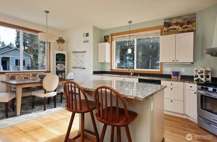 Coastal Elegance Meets Built-Green Innovation in The Highlands! Discover the perfect blend of sophisticated design and sustainable living in this pristine residence, uniquely situated in the coveted neighborhood of The Highlands. Just minutes from the charming seaside village of Langley, this home offers an unparalleled lifestyle for those seeking both a neighborhood community and tranquility. As you step inside this +/- 1,363 sqft sanctuary, you are greeted by an airy, open-concept floor plan defined by 9-foot ceilings, rich hardwood flooring, trim work and solid wood doors throughout. The heart of the home—the kitchen features a cheerful color palate, gleaming granite countertops & stainless steel appliances. A kitchen island with barstool seating serves as the center for cooking and social gatherings. The main-floor primary suite is a true retreat with 3/4 bath and organized California Closet system. Thoughtful upgrades are found throughout, including a new Jotul propane fireplace for Whidbey winters, fresh interior paint, new hot water heater and 1/2 bath with laundry moved upstairs for convenience. Outside, the property is framed by meticulous landscaping and offers serene partial water views from the covered front porch and living room. Whether you are enjoying the insulated garage/hobby space or exploring the abundance of nearby walking trails, this 3 STAR Built-Green certified home represents the pinnacle of Whidbey Island living!
