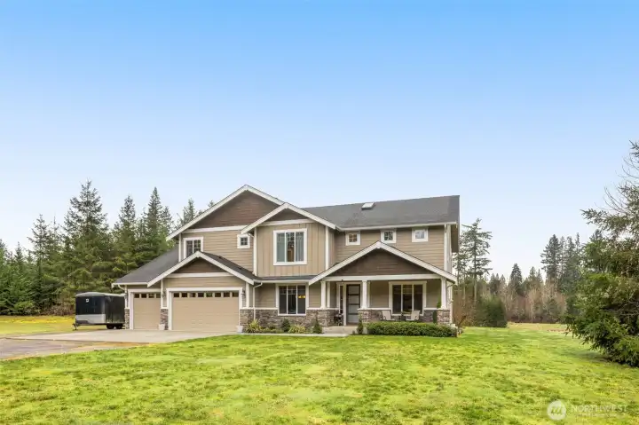 This exceptional home features 3,590 square feet of refined living, built in 2016, with a spacious floor plan, and breathtaking sunset views on approximately 26.7 private acres. With potential to subdivide, the acreage also presents a unique investment or future development opportunity, if desired. Thoughtfully designed for both everyday comfort and elevated entertaining, the home features; a chef’s kitchen with a large island, an office, a dining room, plus indoor and outdoor fireplaces—perfect for cozy evenings or gathering with guests year-round. The first floor also includes a butler’s pantry, 4-car garage and a desirable main-level bedroom and full bath, offering convenience and versatility. The second floor includes a bonus room, three bedrooms, a full bathroom, laundry room and a luxurious primary suite designed as a true retreat, complete with a spa-inspired en suite bath. Surrounded by natural beauty, this remarkable property is a great blend of privacy, opportunity, and convenience. Located close to the Snoqualmie Valley Trail, Lake Marcel and just a quick drive to downtown Carnation. Development and building information available upon request. Don’t miss this rare opportunity to build out a legacy development while living in a gorgeous, well appointed home!