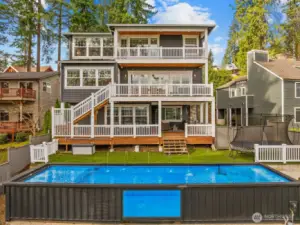 Stunning Lake Views at Juanita Point Experience elevated waterfront living in this 5,030 sq ft, 5-bedroom, 4-bath masterpiece with panoramic Lake Washington views from all three levels. Towering ceilings and walls of windows flood the home with natural light, while the thoughtfully designed main level offers seamless entertaining and everyday living. Upstairs, retreat to a luxurious primary suite featuring a private view deck, cozy fireplace, and spa-inspired five-piece ensuite. Two additional bedrooms complete the upper level. The lower level boasts a spacious game/theater room plus additional bedrooms—ideal for guests or multi-generational living. The chef’s kitchen is a showpiece with dual islands, Wolf range, double Miele dishwashers, walk-in pantry, appliance bay, and French doors opening to the expansive view deck. Enjoy deeded beach rights and the coveted Juanita Point lifestyle—where sunsets, lake breezes, and refined Northwest living await. Architectural above-ground pool with acrylic window wall don't miss the view even when underwater!