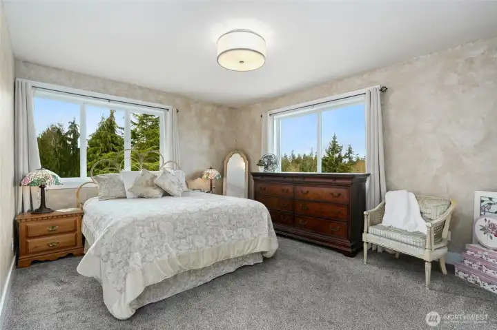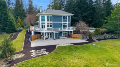 A special place to call home! Beautiful 2 story+bsmt & detached garage w/cottage on gorgeous 5 view acres conveniently sited on the north end of Camano. Lovingly updated with new flooring in some areas, recent paint, NEW ROOF, recent energy systems. Spacious wrap around covered porch, high vaulted great room w/ window wall, window wall & fireplace. Majestic territorial & mountain views (Mt Baker & Cascades) from great room & upstairs. Partial water views from 2nd floor. Main primary suite with private bath. Huge gourmet island kitchen (w/eating space) with hardwood floors, ss appliances, gas cooktop in island, quartz countertops. A great gathering place for family & entertaining w/lots of privacy. Lush landscaping with garden space, RV parking space w/hookups, camp space in woods near house. Sq ft does not include apartment space over garage. See all that Camano has to offer. Sq ft in listing (3212 ) does not include sq ft in garage or cottage. Buyer to verify sq ft and schools to own satisfaction.