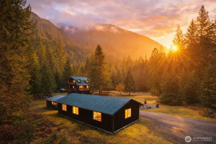 At the edge of the wild, where the mountains rise and the river still runs untamed, nearly 14 acres unfold in the shadow of the North Cascades. Located just outside the gateway to North Cascades National Park and moments from the legendary Skagit River, this curated TURN KEY mountain compound offers a rare convergence of privacy, adventure, and income-generating flexibility just two hours north of Seattle. A chalet-style main residence anchors the property, warm and welcoming against a backdrop of alpine ridgelines and towering evergreens. Generous windows, and wood-forward textures frame the landscape in every direction, blurring the line between indoors and out. This is a home built for storm watching, post-river evenings, and slow mornings wrapped in mountain light. Beyond the main house, a substantial shop and studio workspace expand the possibilities, ideal for gear storage, creative production, fabrication, or entrepreneurial pursuits. Whether hosting retreats, workshops, fly-fishing gatherings, or content creation sessions, the infrastructure is already in place to support a lifestyle that earns as it inspires. The current stewards have thoughtfully shaped the property into a private basecamp, a place where stories are filmed, wildlife still roams, and the rhythm of the river sets the tone for each season. Few properties offer this level of scale, usability, and immersion within such close proximity to the city.