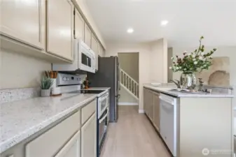 Welcome to Sumerset Creek! This beautifully updated, light-filled end-unit townhome is ideally located in the highly sought-after Bellevue School District, within walking distance to Tyee Middle School and Newport High School. The main level features two spacious bedrooms, including a private primary suite with vaulted ceilings and an en-suite bath—perfect for comfortable main-floor living. Recent upgrades include fresh interior paint, new flooring, creating a clean, modern, and move-in-ready feel throughout. Enjoy an updated kitchen that opens to a cozy family room with a classic wood-burning fireplace, along with a large and open formal living and dining area—ideal for both everyday living and entertaining. Step outside to a new Trex-style back deck, perfect for outdoor dining or relaxing. Upstairs, you’ll find a generous third bedroom with a walk-in closet, offering flexible use as a guest suite, bonus room, or media/TV room. A detached two-car garage adds convenience and extra storage. Conveniently located near freeways, shopping, dining, and everyday amenities, this home truly combines comfort, functionality, and an unbeatable location. HOA dues include water/sewer and garbage.