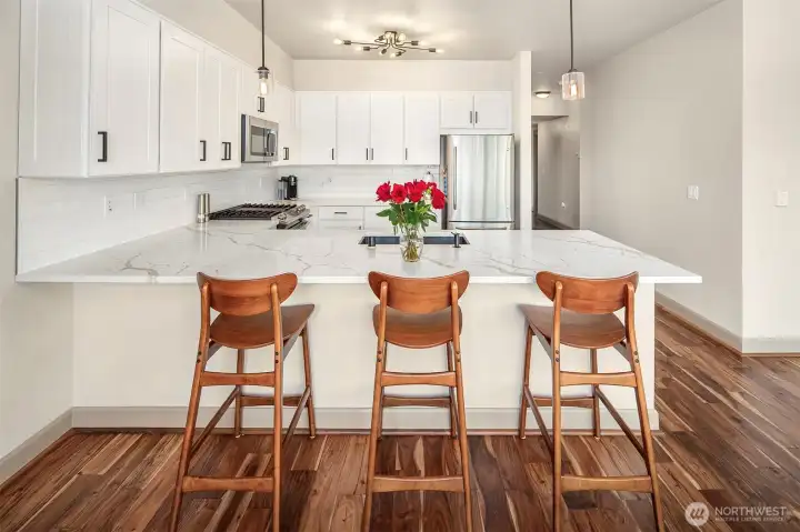 Discover this beautifully updated 2 bed, 2 bath condo at Starpoint Condominiums in the heart of Issaquah Highlands. Featuring an open floor plan, modern kitchen with quartz counters, breakfast bar, stainless steel appliances, new hardwood flooring and a private patio with stunning mountain views for relaxing or dining al fresco. This home blends comfort and style. The spacious primary suite offers a generous walk-in closet and full bath, while the second bedroom is perfect for guests or a home office. Enjoy secure building access with elevator and walkability to shops, dining, trails, and parks. Easy access to I-90 makes commuting a breeze. This unit features 2 assigned parking spaces in secure parking garage with additional storage.