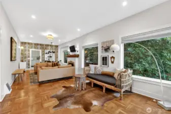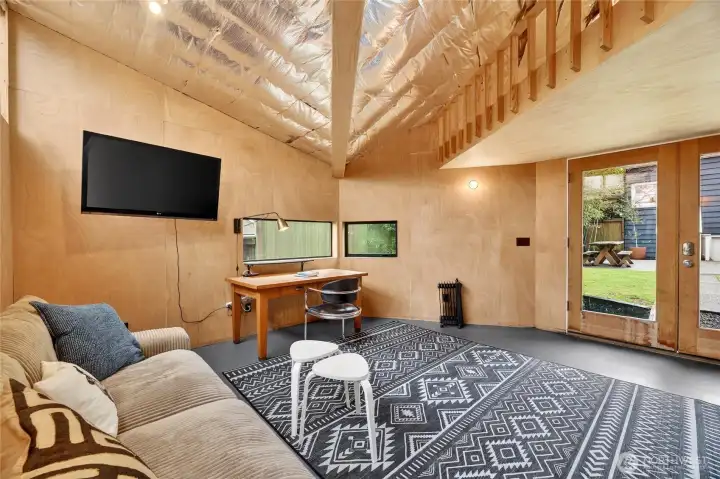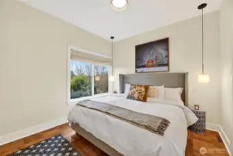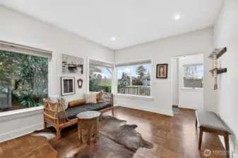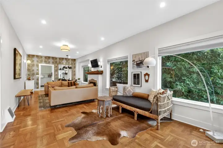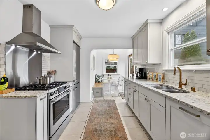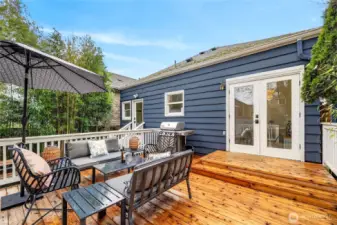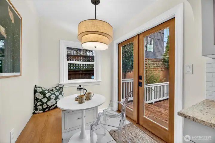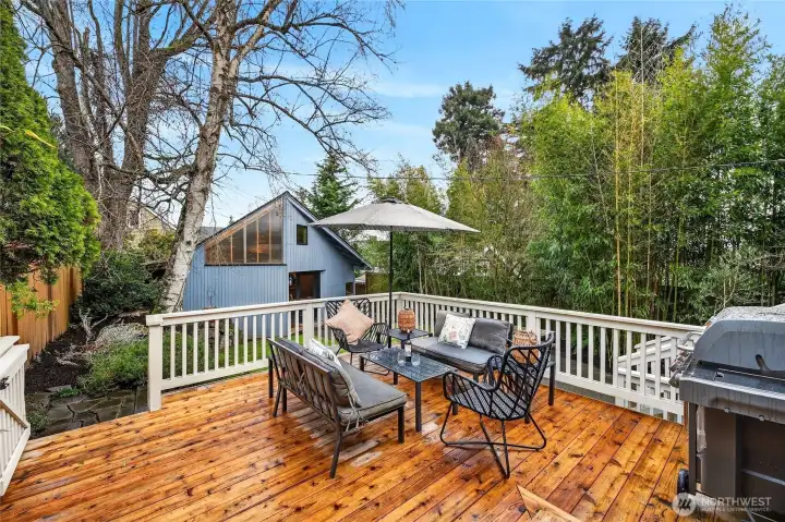 Absolute darling 3 bed, 2.5 bath home perched just above Green Lake, quietly set above the street with peaceful vistas. This beautifully updated residence blends charm and style with tall ceilings, abundant natural light, and gracious, flowing living spaces perfect for everyday living and entertaining. The inviting living and dining areas connect seamlessly to a refreshed kitchen featuring a cozy corner nook—ideal for morning coffee. Designer touches throughout. French doors open to a spacious deck, perfect for BBQs and gatherings. The main level includes two bedrooms with en suite bathrooms, offering comfort and convenience. The lower level features a third bedroom, ¾ bath, laundry area, and an entertainment room, plus ample storage. A detached back structure includes a one-car garage and an exceptional studio with loft—ideal for a home office, gym, guest space, or creative retreat. Private, fenced back yard with mature plantings. Just moments from vibrant Green Lake recreation, dining, and shopping, with easy access to downtown and north-end neighborhoods, this special home offers the perfect blend of tranquility and convenience.