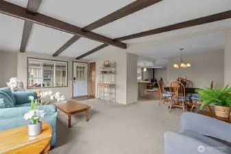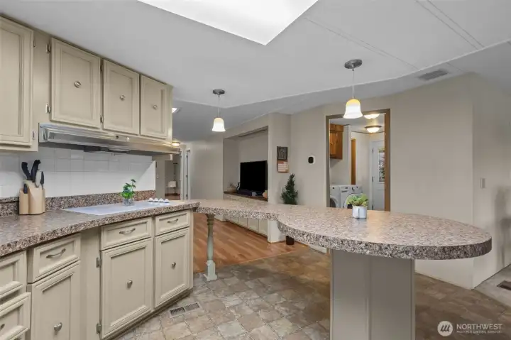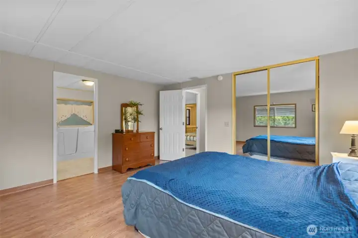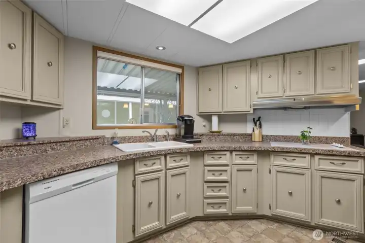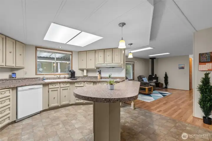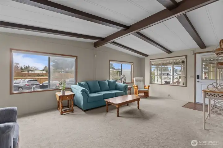 Welcome home to this beautifully maintained 1,488 sq ft residence in a sought-after 55+ community offering resort-style amenities. The open floorplan creates a bright, welcoming feel, enhanced by skylights, pendant lighting, and newly updated flooring in the second living room. Designed for comfort and accessibility, this home features ADA access and a walk-in bathtub for ease and peace of mind. Stay cozy year-round with a free-standing wood stove and efficient heat pump with A/C. The kitchen and living spaces flow seamlessly for everyday living and entertaining, while Hunter Douglas blinds add style and function throughout. Enjoy outdoor living on the huge covered front deck, plus plenty of storage inside and out for all your needs. Located in a vibrant 55+ community with amenities that include a swimming pool, hot tub, pool tables, game room, video library, and large clubhouse with plenty of organized events and get-togethers. Conveniently located close to shopping, freeways and local services, this home offers comfort, lifestyle, and low-maintenance living all in one. Come see it today!