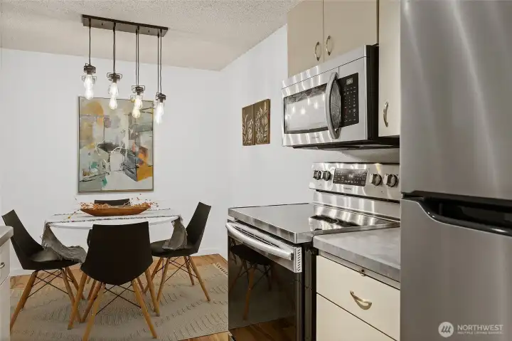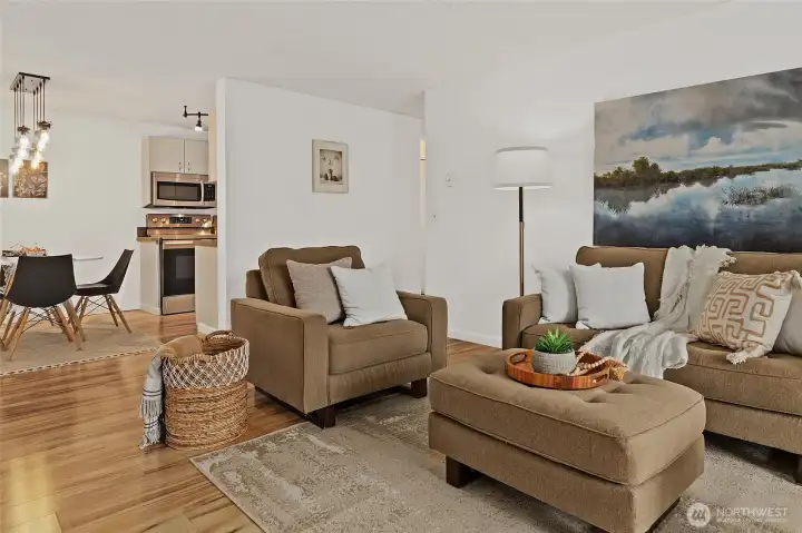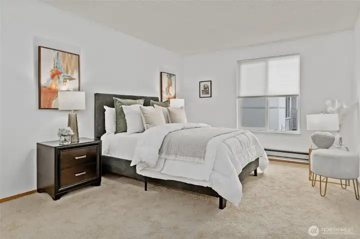 This beautifully updated top-floor, west-facing 2-bedroom condo at Northgate Villa offers 970 sq ft of bright, comfortable living with serene pool views. The kitchen features stainless steel appliances and ample storage, while the dining area and spacious living room flow naturally to a private balcony perfect for relaxing. Updates include wood-laminate flooring, new carpet, fresh paint, and stylish lighting throughout.The generous primary bedroom easily fits a king-size bed and includes an oversized walk-in closet. Community amenities elevate everyday living with a pool, sauna, bike storage, gated parking, and secure building access.Ideally located near the Northgate Light Rail Station, I-5, the Kraken Community Iceplex, Thornton Creek Reserve, shopping, dining, and entertainment. This pet-friendly, no-rental-cap condo offers convenience, flexibility, and an unbeatable commuter location.