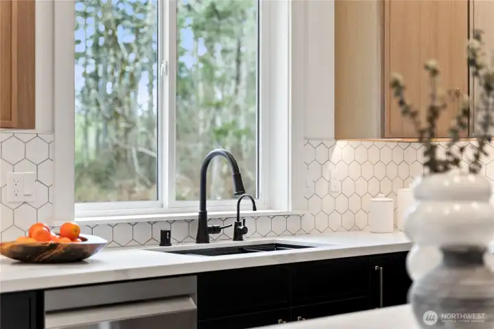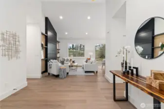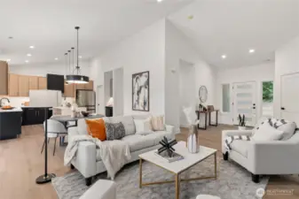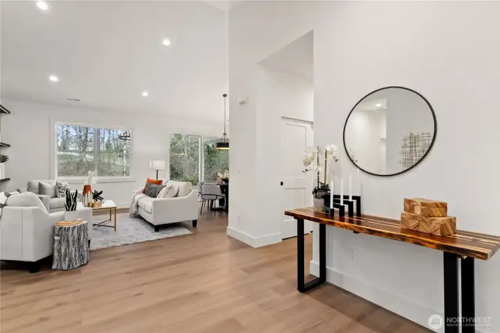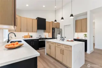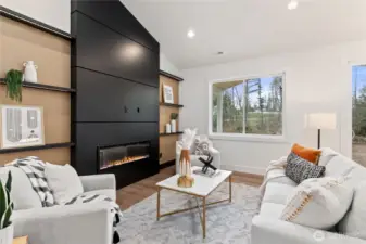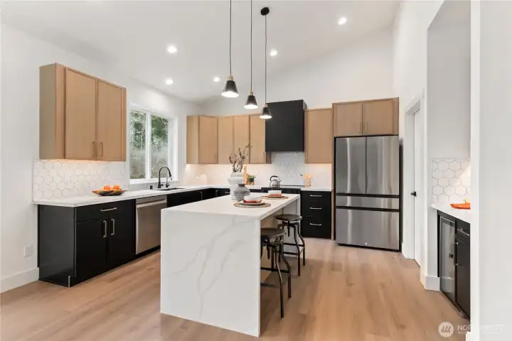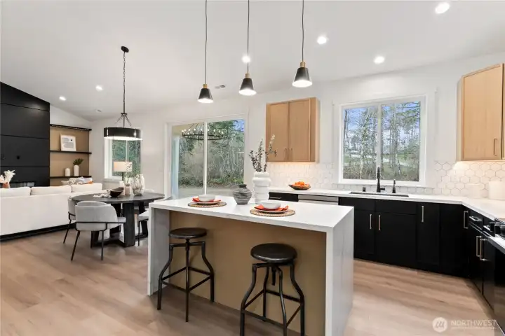 Quality-built new construction rambler on over 2-acres in Gig Harbor! Tucked away on a quiet cul-de-sac at the end of a dead-end street, this stunning 4-bedroom, 2.5-bath home offers 1,755 sq ft of thoughtfully designed living space with a spacious 3-car garage. Step inside to vaulted ceilings and an open-concept layout filled with natural light. The beautifully appointed kitchen features modern cabinetry, designer backsplash, quartz countertops, a large island, beverage cooler, and a generous walk-in pantry. The great room showcases a striking fireplace with custom wall feature, creating a warm and inviting focal point. Retreat to the primary suite with elegant paneled accent wall and sconce lighting. The luxurious 5-piece ensuite offers a freestanding soaking tub, tiled shower, and refined finishes for a spa-like experience. Enjoy peaceful outdoor living on the covered back patio with wood-paneled ceiling and hanging light, ideal for relaxing or entertaining year-round. Private, serene, and just minutes from Gig Harbor amenities, this property offers the perfect blend of modern comfort and Northwest charm.