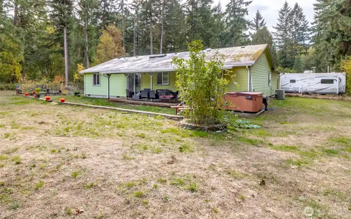 This is the one you have been waiting for! Super clean rambler on just under 2 ACRES of land in a private setting yet still close to many conveniences and JBLM! Open kitchen with elevated bar and cozy living space with tons of storage! Spacious primary with great closet space and bath plus 2 more generous bedrooms and full bath on other side of the home for added privacy. Huge walk in pantry off kitchen. Heat pump for year round comfort and A/C. Outside is a covered deck off the back for year round enjoyment with a salt water therapy spa. Huge, private FULLY fenced yard with electric security gate for the animals or garden. Separate 600 sq.ft shop/garage with carport. RV parking too with hookups!Pre wired for generator- current generator needs starter. This is a great Roy home ready to go!