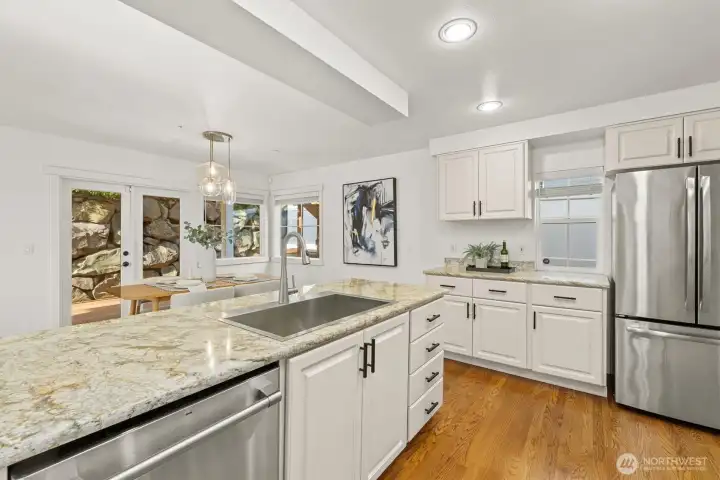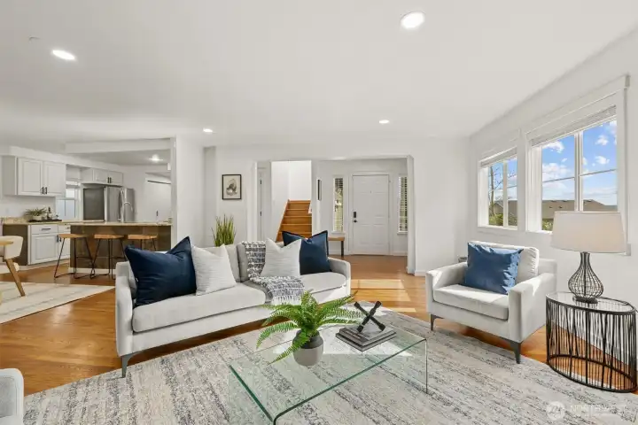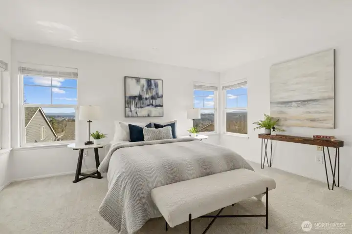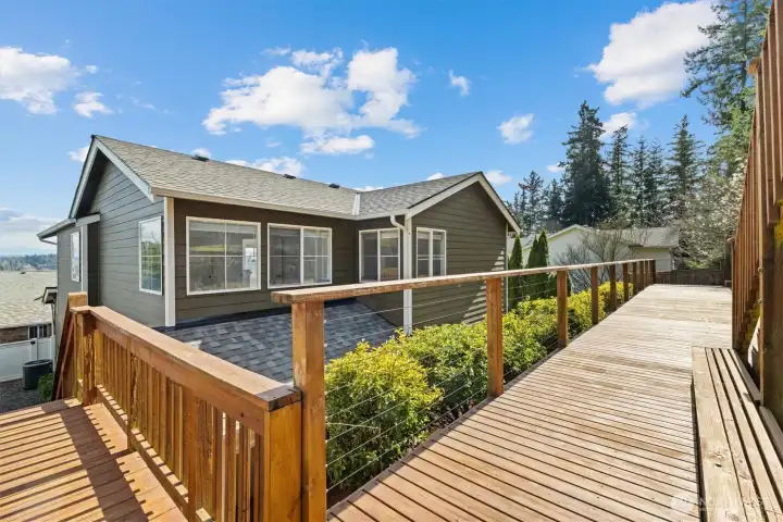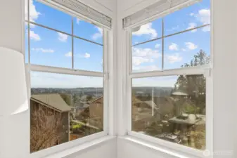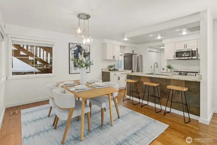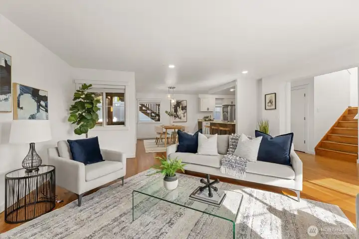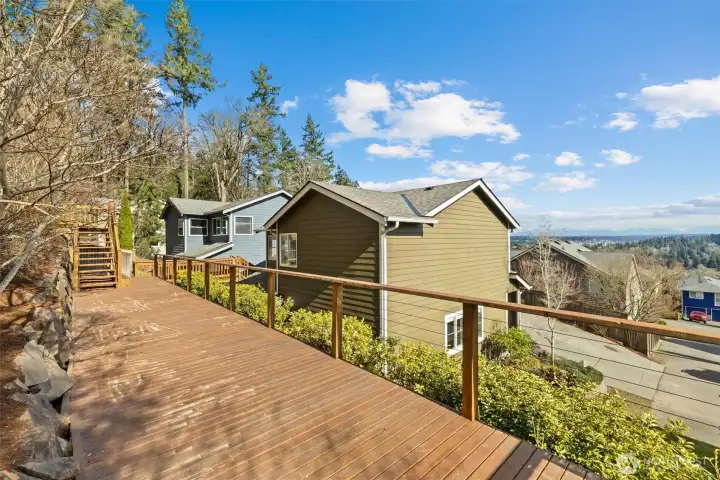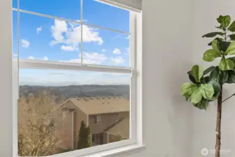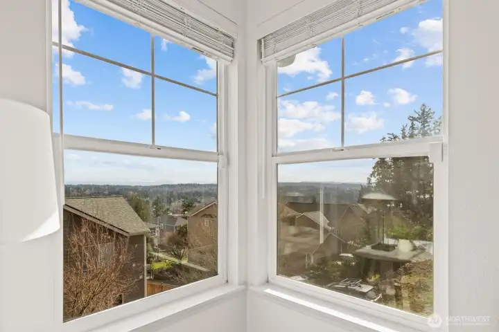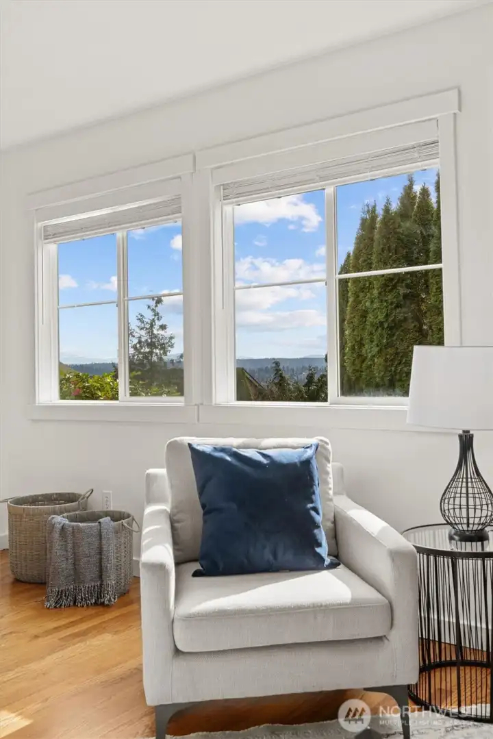 Welcome to this light-filled home on desirable Goat Hill, offering elevated views and just minutes from Juanita Beach Park, as well as Kirkland’s key amenities and commuter routes. Hardwood floors and a gas fireplace anchor the bright living room, while the open floor plan supports both everyday comfort and efficient use of space. The dining area extends to a covered wooden deck, creating a private outdoor setting. The primary bedroom enjoys sunrise exposure, natural light, and a renovated ensuite bath. An east-facing bedroom provides flexibility as a home office with scenic outlooks. Outdoors, the fully fenced, tiered yard features an upper deck with views of Lake Washington, Mt. Rainier, and vibrant sunsets. With A/C throughout and substantial updates including roof, gutters, furnace, paint, and renovated baths, the home offers move-in-ready confidence. Convenient to Totem Lake Village, Juanita Village, downtown Kirkland, major freeways, and Lake Washington schools, this property delivers comfort with strong location access.