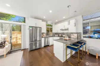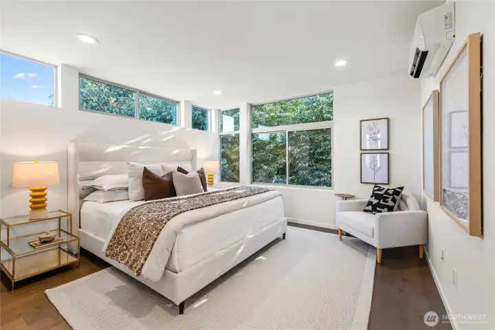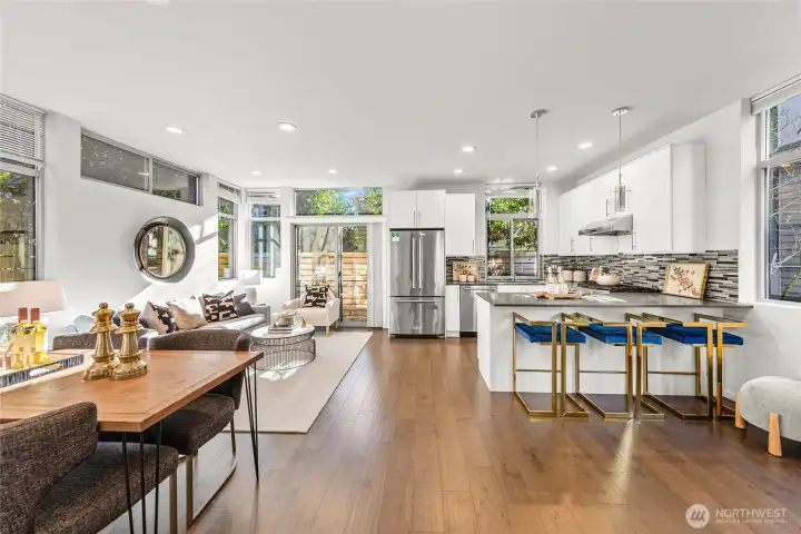 Rare detached home in the heart of Ballard, blending walkable city living with modern comfort. This light-filled standalone residence features an open floor plan, hardwood floors throughout, and a gourmet kitchen with quartz countertops and premium appliances—ideal for everyday living and entertaining. Upstairs offers a spacious primary suite plus a flexible bonus room for an office or guest space. Enjoy city and Rainier views from the private rooftop deck. Mini-split heating and cooling provide year-round comfort, and dedicated off-street parking adds rare convenience. Prime location: 5-minute walk to RapidRide D Line and Route 40, 2-minute walk to Amazon shuttle, and steps to Ballard’s dining, cafés, breweries, parks, and Golden Gardens Beach. Zoned for top Ballard schools. A rare opportunity to own a private, well-connected home in one of Seattle’s most desirable neighborhoods.