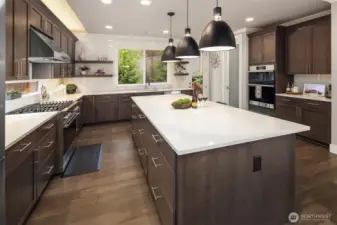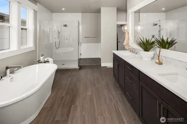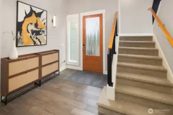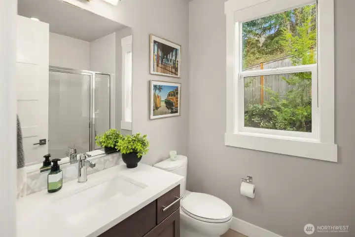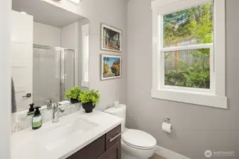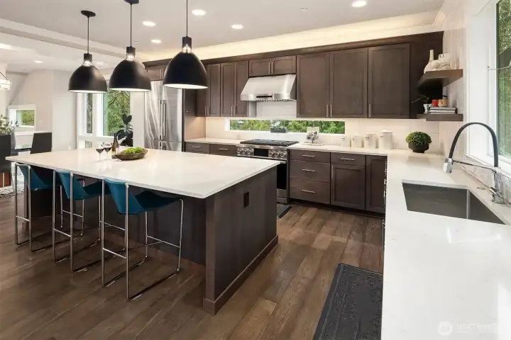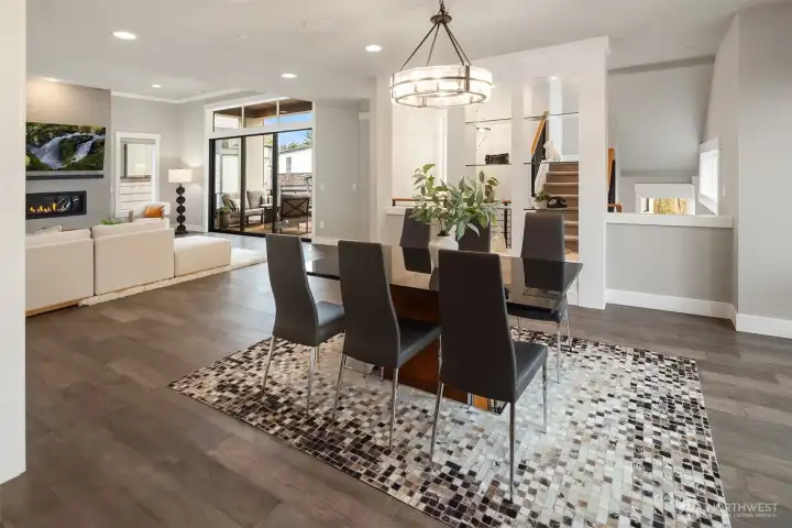 Located in the sought after Vedana neighborhood of Bellevue, the former model home showcases an exceptional level of upgrades and designer finishes throughout. The thoughtfully designed floor plan offers 4 bedrooms, 3.25 baths, a spacious great room that could be a large office or theater room. The gourmet kitchen features Decor SS appliances, upgraded cabinetry, large walk-in pantry, and hardwood floors that flow throughout the main level. Elegant touches included 8' doors, modern railings, designer lighting and fixtures, upgraded carpet, and a smart home system with Bluetooth Sonos ceiling speakers throughout. A main floor bedroom with its own bath is ideal for guests or multi-generational living. Enjoy seamless indoor-outdoor living with a large stacking slider leading to the front deck. French doors welcome you into the primary suite offers dual closets, beautiful bathroom with large soak in tub to relax! A rare opportunity to own a former model home loaded with builder upgrades including modern glass garage doors with epoxy floors, custom automated window coverings, AC, peek-a-boo view of the lake, close to parks, trails, shopping and top-rated schools.