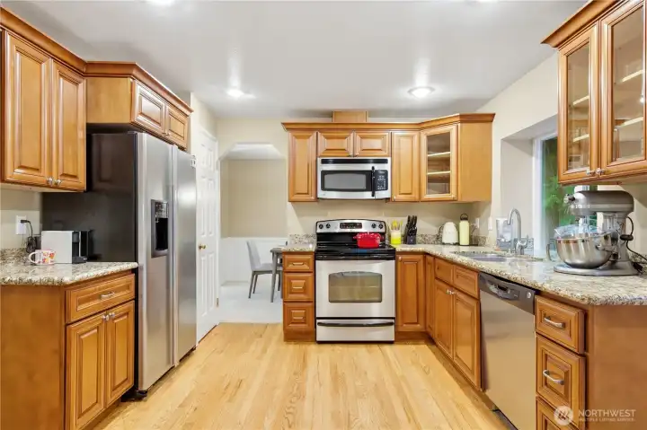 Beautifully maintained 4-bedroom home featuring a spacious primary suite with walk-in closet upstairs and a convenient main-level bedroom—ideal for guests or multi-generational living. The updated kitchen showcases granite countertops and rich cherry cabinetry, complemented by matching finishes in the bathrooms for a cohesive, upscale feel. Sunlit formal living and dining rooms create an inviting first impression, while the cozy family room with gas fireplace offers the perfect place to unwind. Newly installed A/C ensures comfort all summer long. Step outside to a private backyard retreat with an expansive entertainment deck overlooking a serene greenbelt and a hot tub spa—perfect for relaxing evenings or memorable gatherings. The low-maintenance yard means more enjoyment and less upkeep. This home is equipped with a connected standby generator, providing reliable backup power and year-round peace of mind. Ideally located near parks, top-rated schools, and everyday amenities, this pre-inspected home is truly move-in ready.