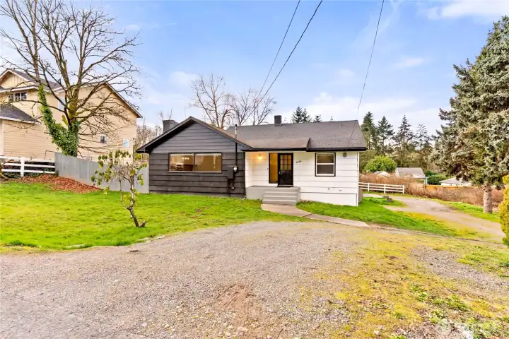 Rare find in Tacoma on 1.4 acre lot. Tucked away on a quiet dead-end street, this property offers privacy, space, with an expansive front and back yard allowing plenty of room for gardening or entertaining.This charming 2-bedroom, 1-bath home features a spacious living room with a cozy wood-burning fireplace and beautiful stone surround, perfect for relaxing evenings. The bright kitchen offers great natural light and functional layout, while laminate flooring flows throughout the main living areas.Enjoy outdoor living year-round with both covered front and back decks, ideal for gatherings or peaceful mornings. A detached 2-car garage/shop provides ample parking and storage.The basement includes separate exterior access, a large rec room, bonus room/storage area, and large utility room. With its generous layout, it offers strong potential for additional living space. The water heater is like new, and the home also features a newer roof for added peace of mind.Large acreage, privacy, and versatility within Tacoma, properties like this are a rare find!