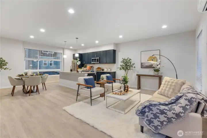 Stunning Three-story contemporary CORNER unit near Lake Stickney! Brightly lit with plenty of sunlight, Large foyer on entry level and massive great room with covered deck on the Main floor. Designer kitchen with oversized island, Quartz counters, & SS appliances. Pocket office, perfect for work from home space. Featuring a Primary suite with private bath, split A/C & walk-in closet with additional beds/bath, plus utility room for full sized W/D. The 2nd floor boasts a massive great room, dining room, island kitchen with bar seating, and stylish laminate hardwood flooring. Super easy access to Seattle, Bothell, & Alderwood mall. Great proximity to I405 & I90. Mukilteo School District.