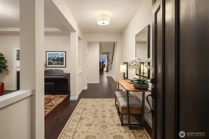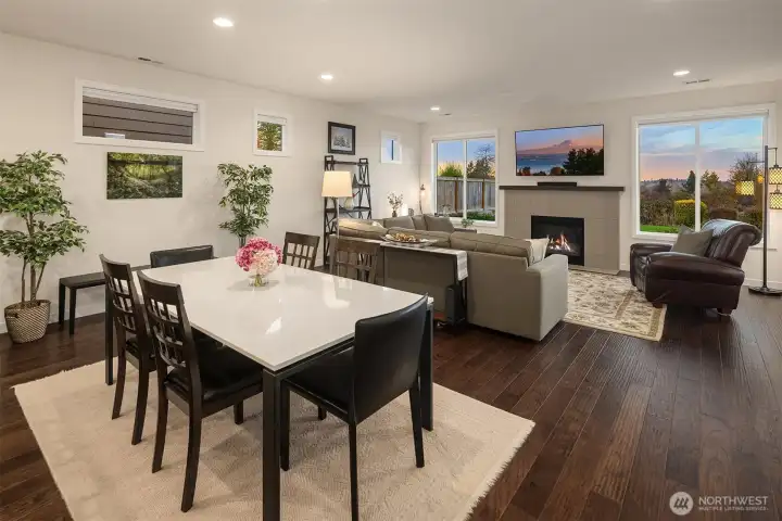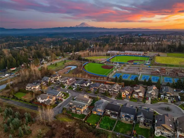 Embrace Serenity in Sought-After Seramonte ~ Magnificently perched atop Lea Hill with sweeping panoramic views from Mount Baker & the Cascades to Mount Rainier & beyond, this dazzling Northwest Contemporary stunner is the find of a lifetime! Lavishly appointed with high-end finishes, spacious rooms & modern designer style, the brilliant open concept boasts 5 beds & 2.75 baths across 3,090sf of luxurious living space. Rich wide-planked hardwoods, upscale millwork & copius layered lighting grace the interior while tall ceilings & abundant oversized windows fill the home in natural light. Showcase kitchen with premium appliances, quartz counters, full-height tile backsplash & expansive island bar opens to dining space, family room with gas fireplace & dramatic horizontal rail open staircase with upper hallway loft. An entertainer's dream, the butler's pantry flows seamlessly into the formal living room with tray ceiling & the massive covered lanai wrapped in glass brings the outdoors in. Elegant primary oasis with cathedral ceiling, wrap-around view windows & spa-like 5-piece ensuite. Upper bedrooms feature adjoining Jack & Jill bath with dual sink vanity. Huge double-door bonus room with jaw dropping sunsets over Mount Rainier. Extra deep 3-car garage + on-demand water heater, high efficiency furnace & central A/C. Sprawling 7,309sf level lot backed to secluded open space. Calm & tranquil yet convenient & practical with major highways & essential amenities just minutes away!